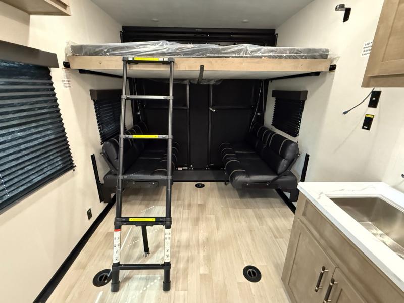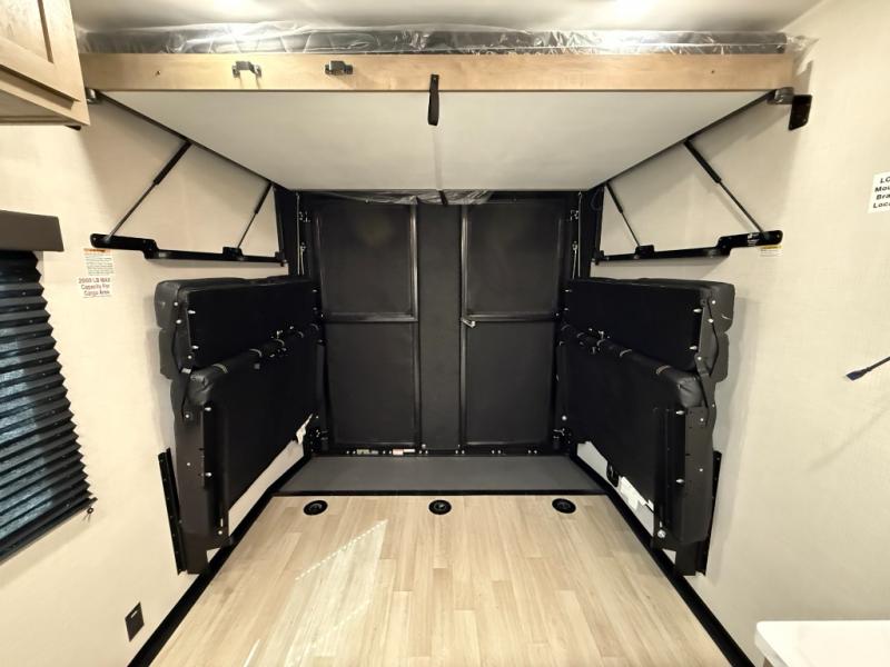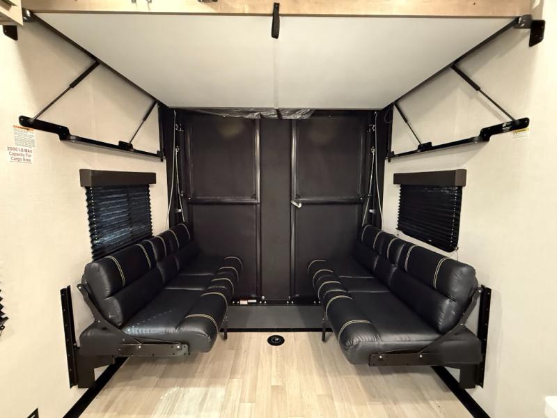 Rear Garage (13ft4in): Dual opposing sofas with overhead bunk, fold-into-bed design. Tie-downs built into frame welds secure toys or gear.