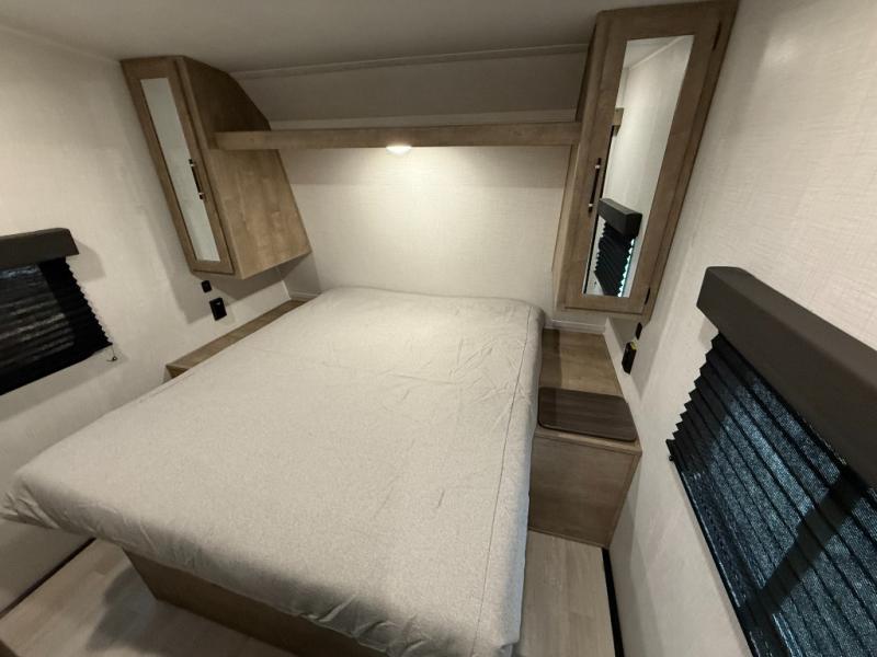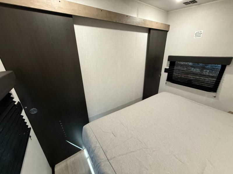 Front Master Bedroom: Private RV queen bed with dual-entry to bathroom.