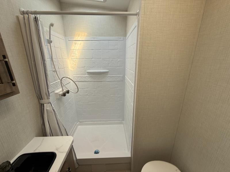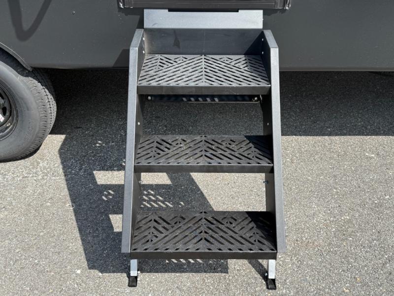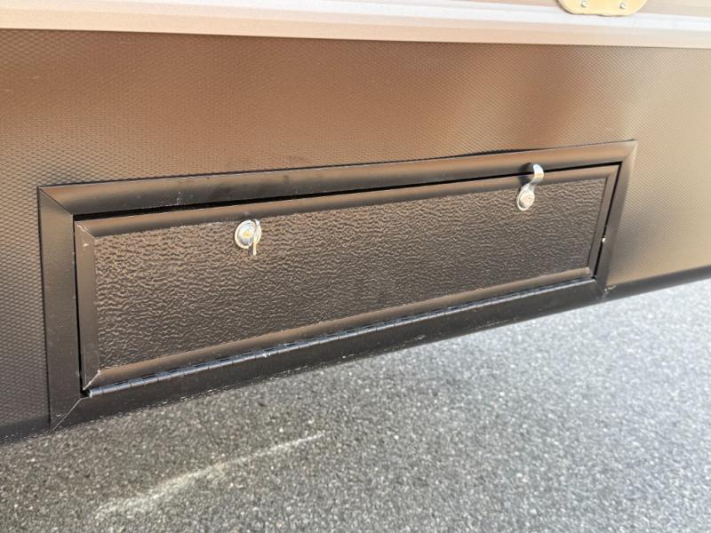 Exterior: Wide-body aluminum construction, one-piece heated underbelly, 8ft garage door, leaf-spring suspension, 18' electric awning with LED lights and auto dump. 50amp service.