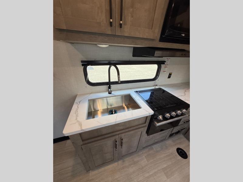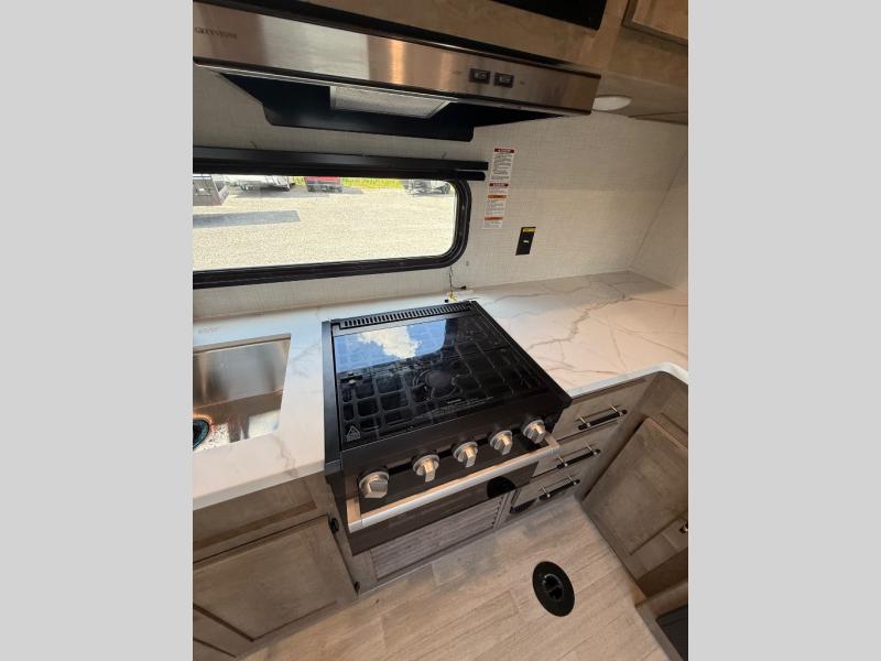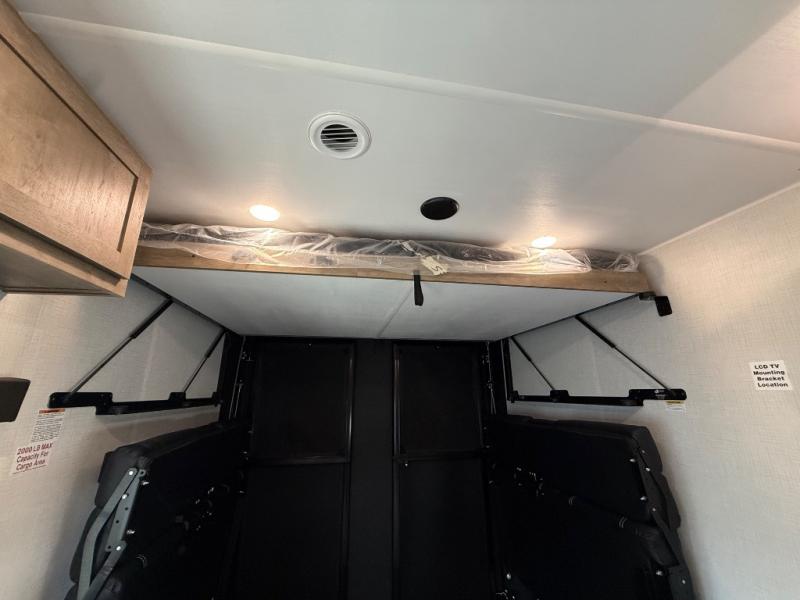 This open concept toy hauler is sure to meet all of your needs. There is a full kitchen with a Furrion three burner gas range and a microwave oven to prepare meals, plus a 10 cu. ft. 12V refrigerator to keep food fresh. You'll find comfortable seating space on the dual opposing sofas with a top queen bed, and there is TV prep if you want to add some entertainment. The RV queen bed in the front master bedroom will bring a great night's rest, and the dual entry bath lets you clean up after trail riding. When you're ready to head home, the 13' 4" garage area includes frame welded tie downs to keep your toys secure.