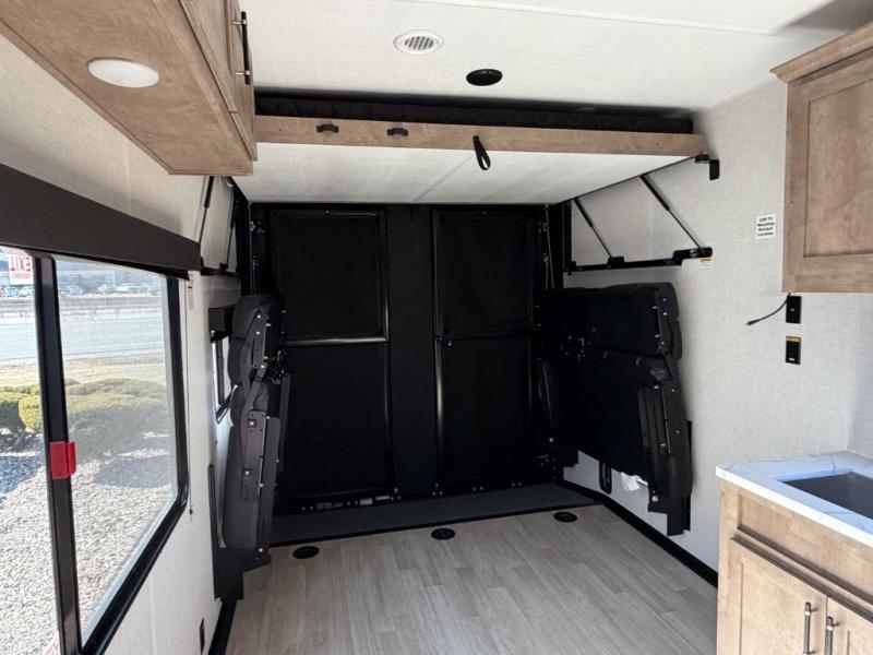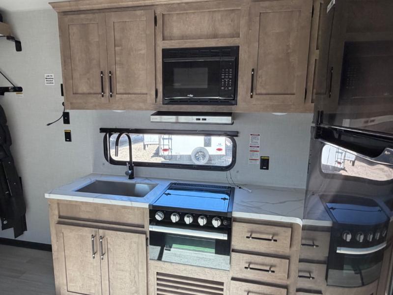 This open concept toy hauler is sure to meet all of your needs. There is a full kitchen with a Furrion three burner gas range and a microwave oven to prepare meals, plus a 10 cu. ft. 12V refrigerator to keep food fresh. You'll find comfortable seating space on the dual opposing sofas with a top queen bed, and there is TV prep if you want to add some entertainment. The RV queen bed in the front master bedroom will bring a great night's rest, and the dual entry bath lets you clean up after trail riding. When you're ready to head home, the 13' 4" garage area includes frame welded tie downs to keep your toys secure.