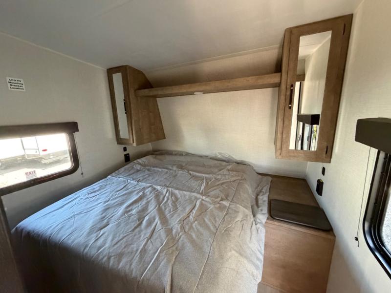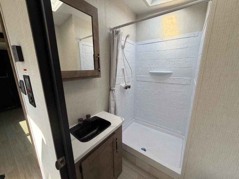 The larger shower is just the beginning - our toy haulers are designed to provide the comforts of home, so you can focus on making memories. All units feature large tinted safety glass windows, providing stunning views and added protection. The Dexter® E-Z Lube® axles ensure smooth towing and reduced maintenance, while the 5K lbs. frame welded tie-downs keep your toys secure and stable on the road. Plus, the one-touch electric awning with LED lights provides shade and ambiance, perfect for relaxing outdoors. And you can always stay connected and safe with the Furrion wireless backup camera prep, making maneuvering a breeze.