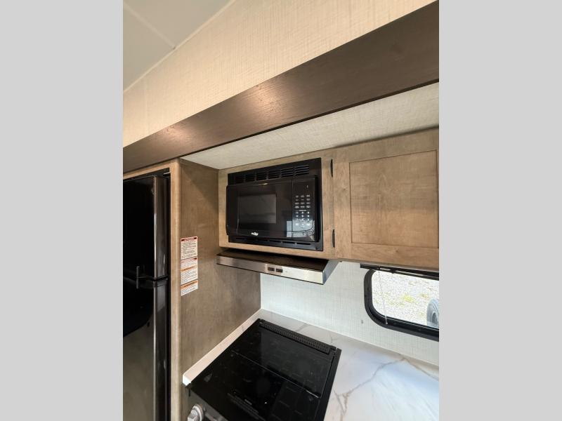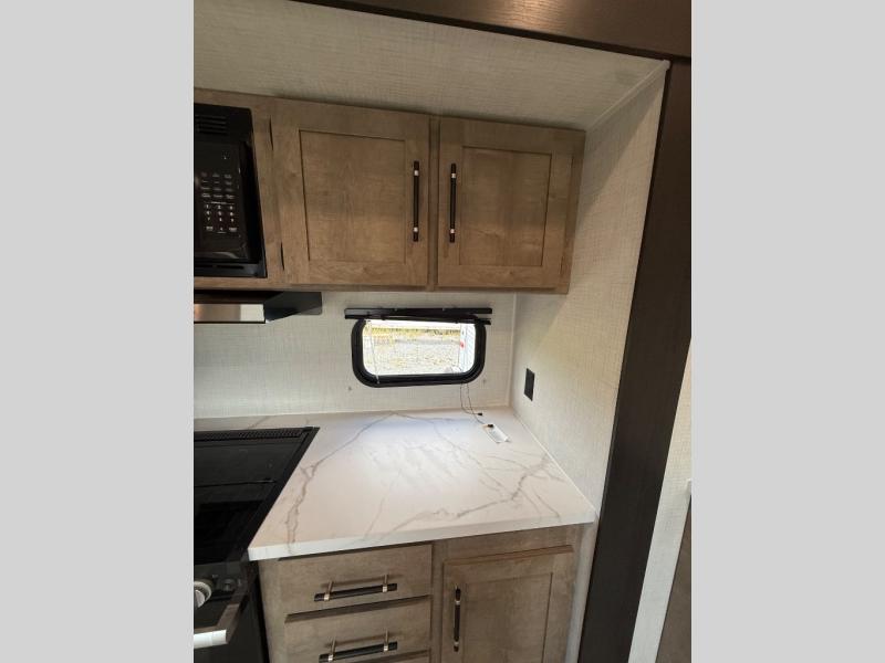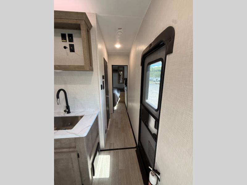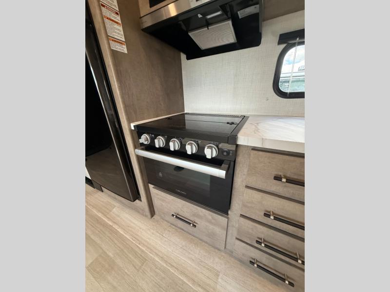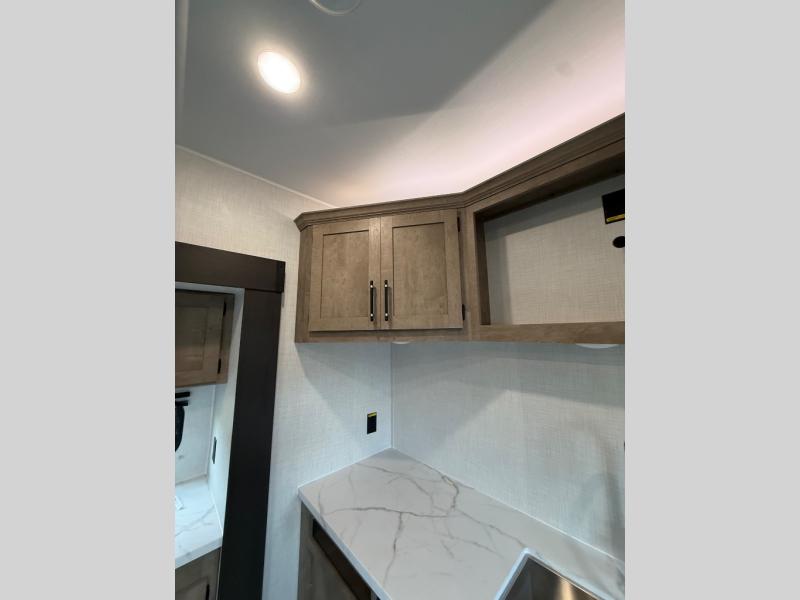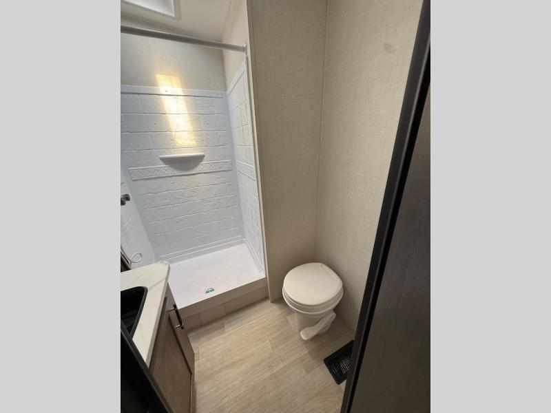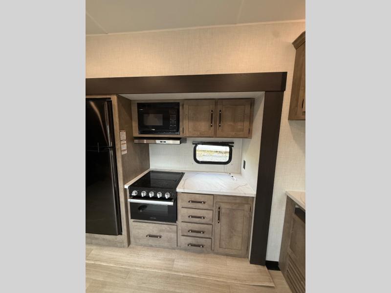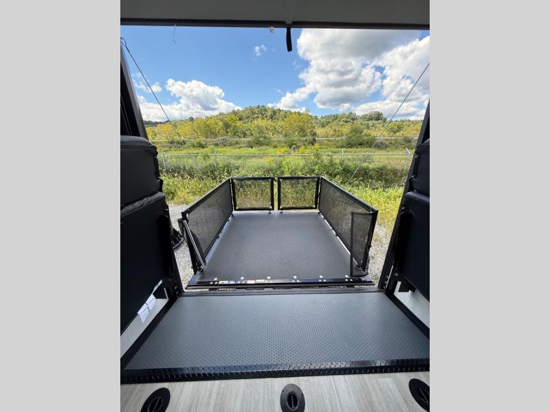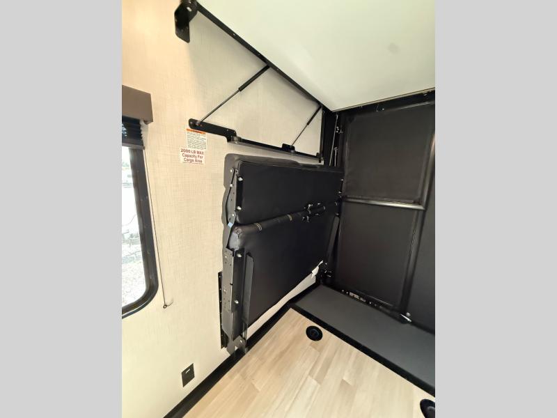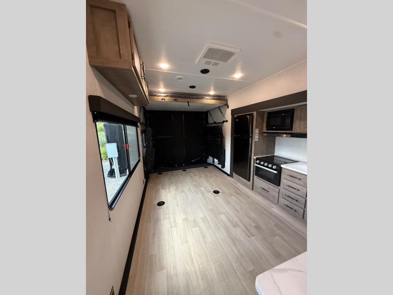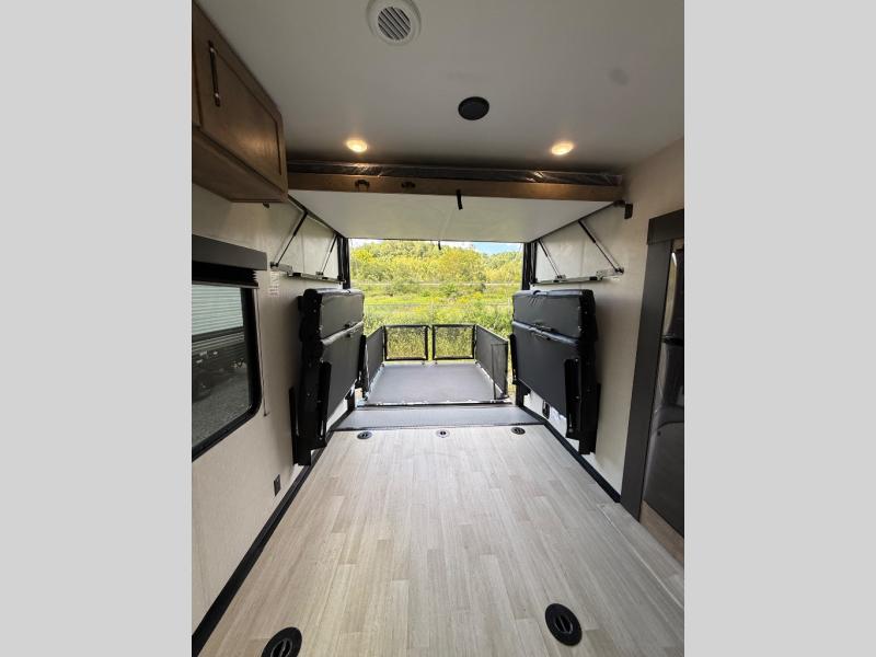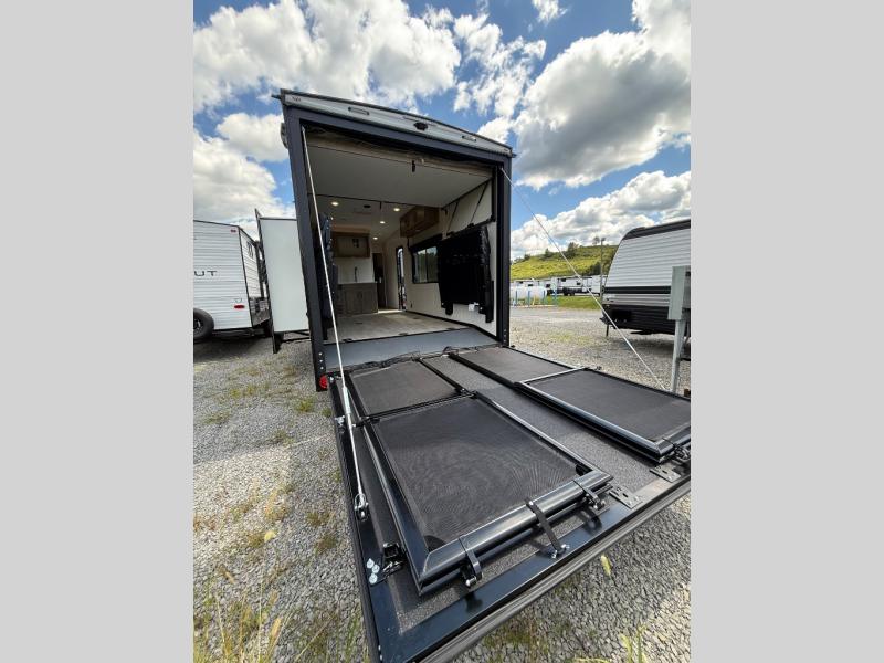 This open concept toy hauler is sure to meet all of your needs. There is a slide out for more space, a full kitchen with a Furrion three burner gas range and a microwave oven to prepare meals, plus a 10 cu. ft. 12V refrigerator to keep food fresh. You'll find comfortable seating space on the dual opposing sofas with a top queen bed, and there is TV prep if you want to add some entertainment. The RV queen bed in the front master bedroom will bring a great night's rest, and the full bath lets you clean up after trail riding. When you're ready to head home, the 15' garage area includes frame welded tie downs to keep your toys secure.