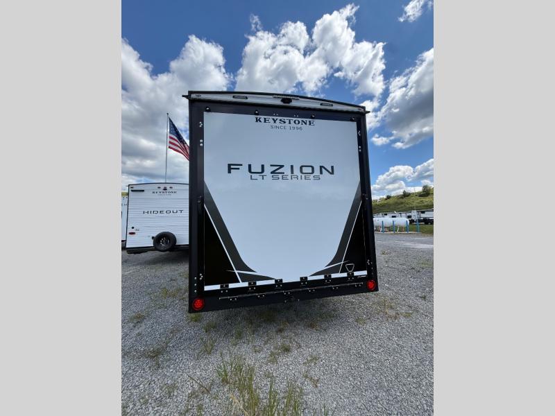Embrace the great outdoors with a Fuzion Impact Edition toy hauler by Keystone! There is an aluminum exterior and a 8' 4" wide-body construction for your toys and gear! The one-piece polypropylene heated underbelly includes enclosed tanks and valves which will help extend your camping season, and the leaf spring suspension system will provide smooth towing. Head inside to enjoy night shades, hardwood cabinetry, and fiberglass backed linoleum floor with no carpet-free for easy cleaning. Each model also includes a Girard on-demand water heater, two 30 lb. LP tanks, recessed LED puck lighting throughout, and the list of comforts goes on!