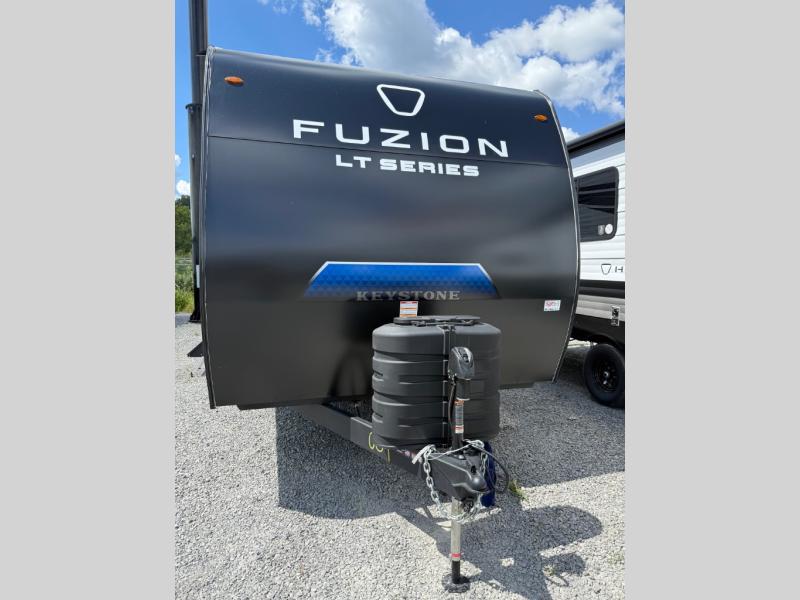 Embrace the great outdoors with a Fuzion Impact Edition toy hauler by Keystone! There is an aluminum exterior and a 8' 4" wide-body construction for your toys and gear! The one-piece polypropylene heated underbelly includes enclosed tanks and valves which will help extend your camping season, and the leaf spring suspension system will provide smooth towing. Head inside to enjoy night shades, hardwood cabinetry, and fiberglass backed linoleum floor with no carpet-free for easy cleaning. Each model also includes a Girard on-demand water heater, two 30 lb. LP tanks, recessed LED puck lighting throughout, and the list of comforts goes on!