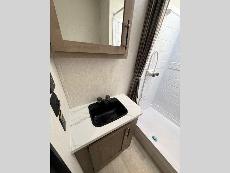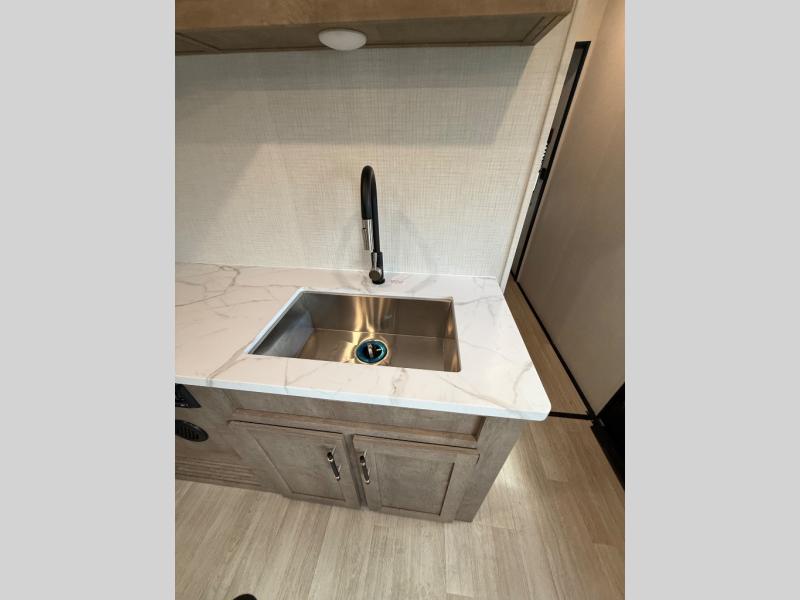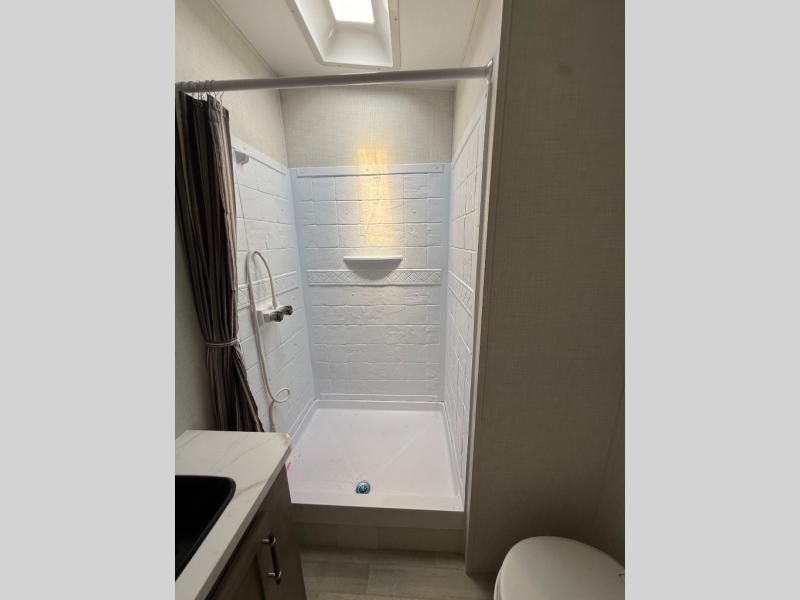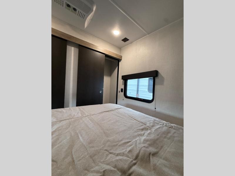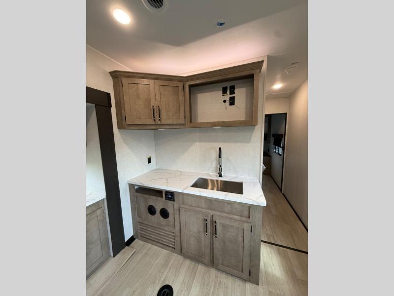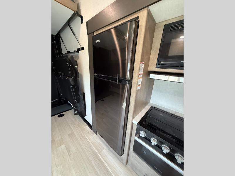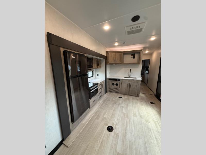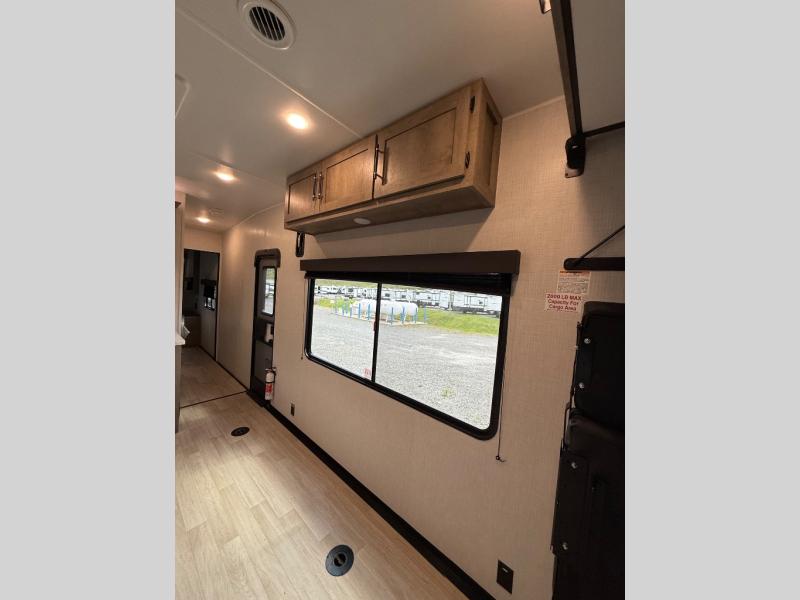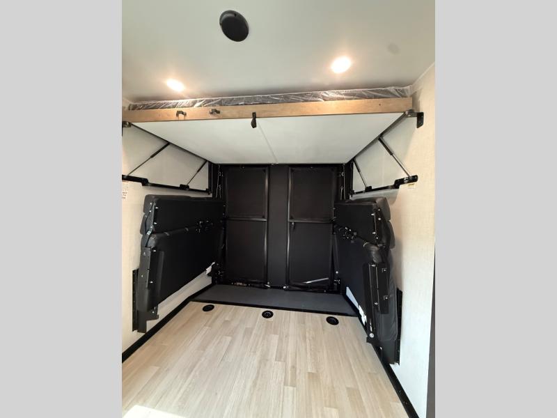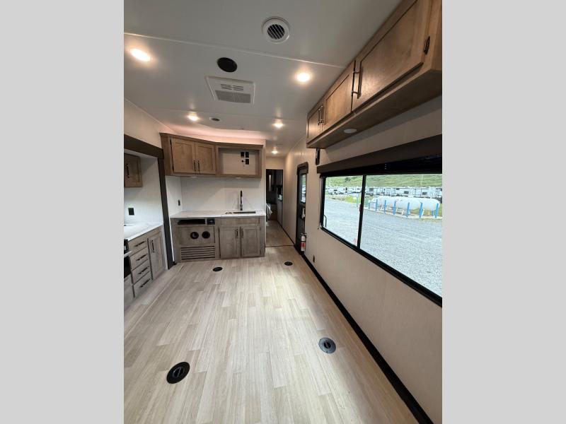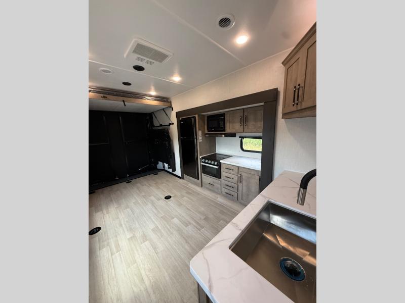 This open concept toy hauler is sure to meet all of your needs. There is a slide out for more space, a full kitchen with a Furrion three burner gas range and a microwave oven to prepare meals, plus a 10 cu. ft. 12V refrigerator to keep food fresh. You'll find comfortable seating space on the dual opposing sofas with a top queen bed, and there is TV prep if you want to add some entertainment. The RV queen bed in the front master bedroom will bring a great night's rest, and the full bath lets you clean up after trail riding. When you're ready to head home, the 15' garage area includes frame welded tie downs to keep your toys secure.