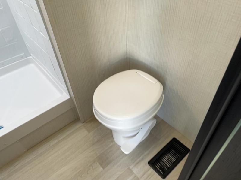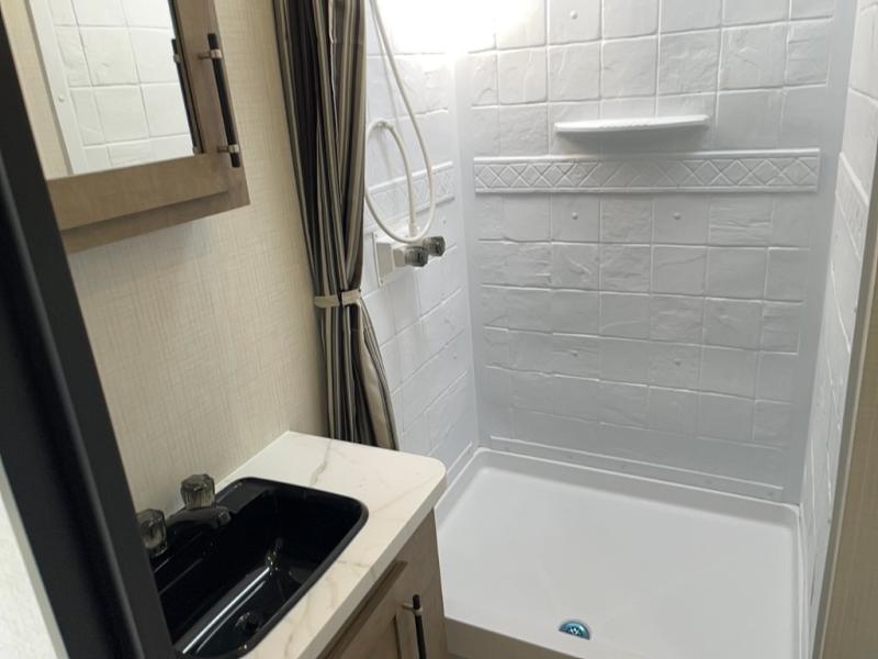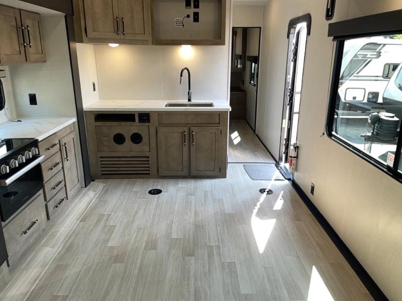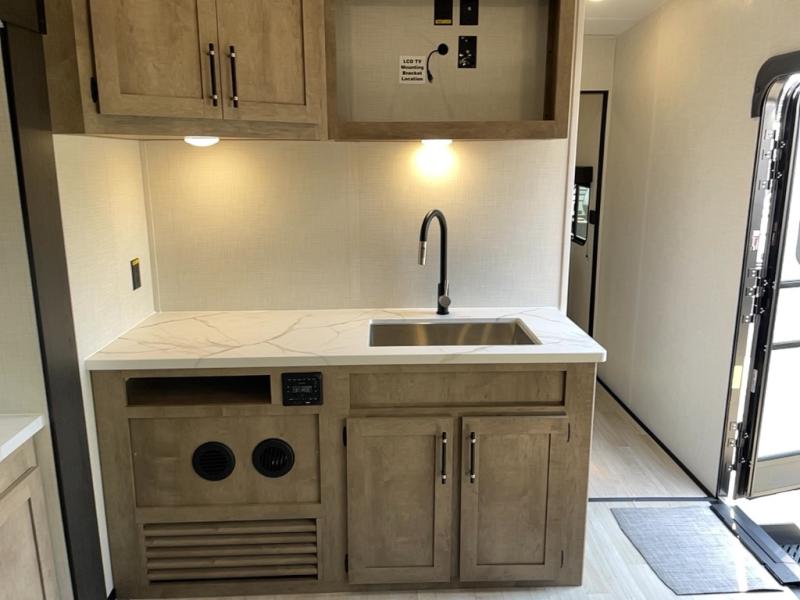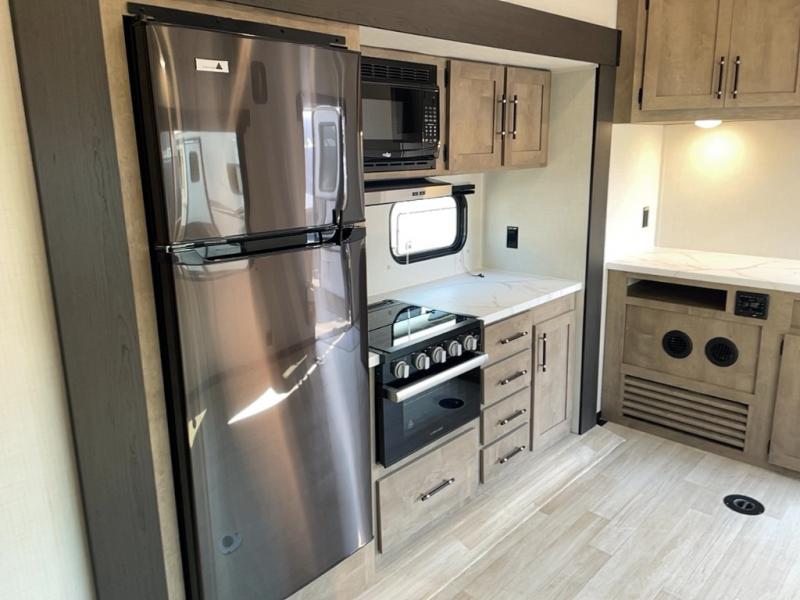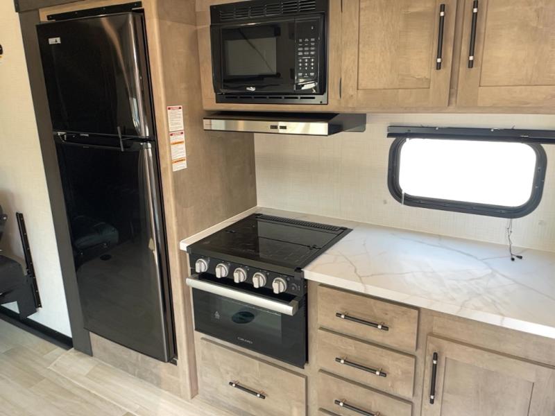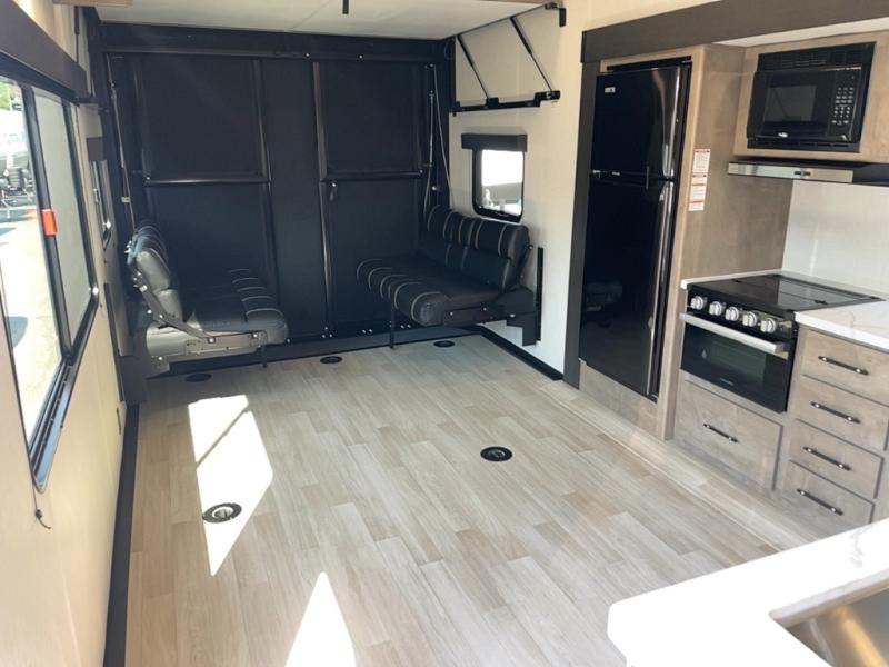 This open concept toy hauler is sure to meet all of your needs. There is a slide out for more space, a full kitchen with a Furrion three burner gas range and a microwave oven to prepare meals, plus a 10 cu. ft. 12V refrigerator to keep food fresh. You'll find comfortable seating space on the dual opposing sofas with a top queen bed, and there is TV prep if you want to add some entertainment. The RV queen bed in the front master bedroom will bring a great night's rest, and the full bath lets you clean up after trail riding. When you're ready to head home, the 15' garage area includes frame welded tie downs to keep your toys secure.
