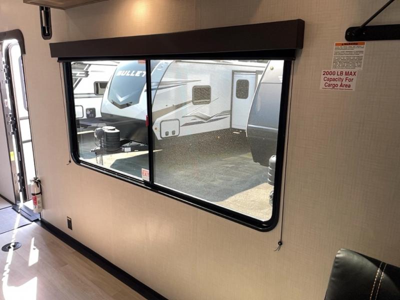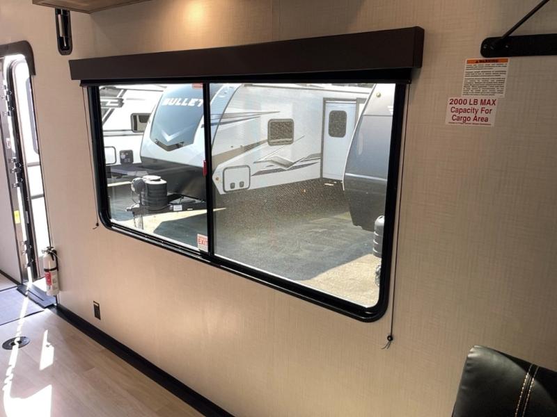 Embrace the great outdoors with a Fuzion Impact Edition toy hauler by Keystone! There is an aluminum exterior and a 8' 4" wide-body construction for your toys and gear! The one-piece polypropylene heated underbelly includes enclosed tanks and valves which will help extend your camping season, and the leaf spring suspension system will provide smooth towing. Head inside to enjoy night shades, hardwood cabinetry, and fiberglass backed linoleum floor with no carpet-free for easy cleaning. Each model also includes a Girard on-demand water heater, two 30 lb. LP tanks, recessed LED puck lighting throughout, and the list of comforts goes on!