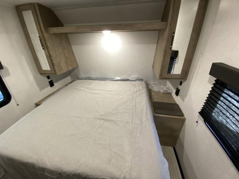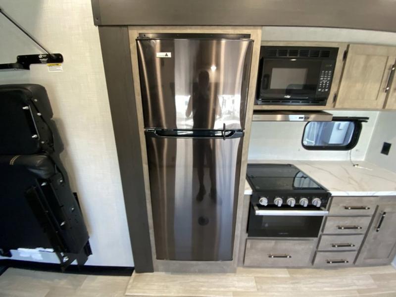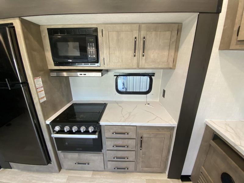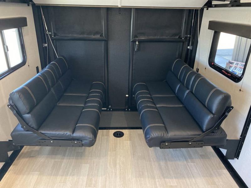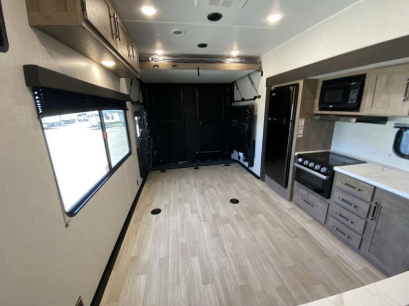 This open concept toy hauler is sure to meet all of your needs. There is a slide out for more space, a full kitchen with a Furrion three burner gas range and a microwave oven to prepare meals, plus a 10 cu. ft. 12V refrigerator to keep food fresh. You'll find comfortable seating space on the dual opposing sofas with a top queen bed, and there is TV prep if you want to add some entertainment. The RV queen bed in the front master bedroom will bring a great night's rest, and the full bath lets you clean up after trail riding. When you're ready to head home, the 15' garage area includes frame welded tie downs to keep your toys secure.