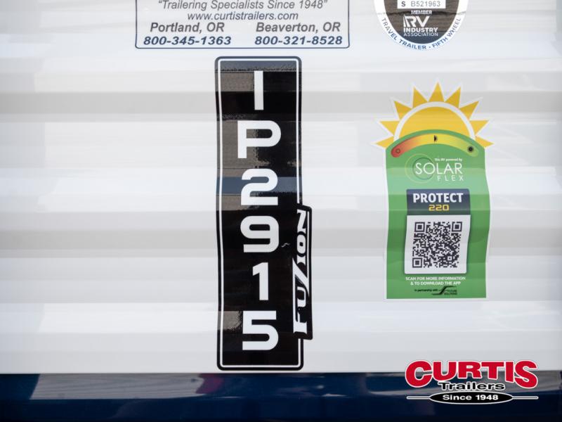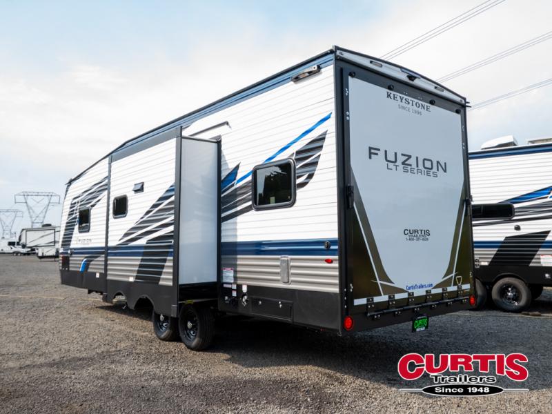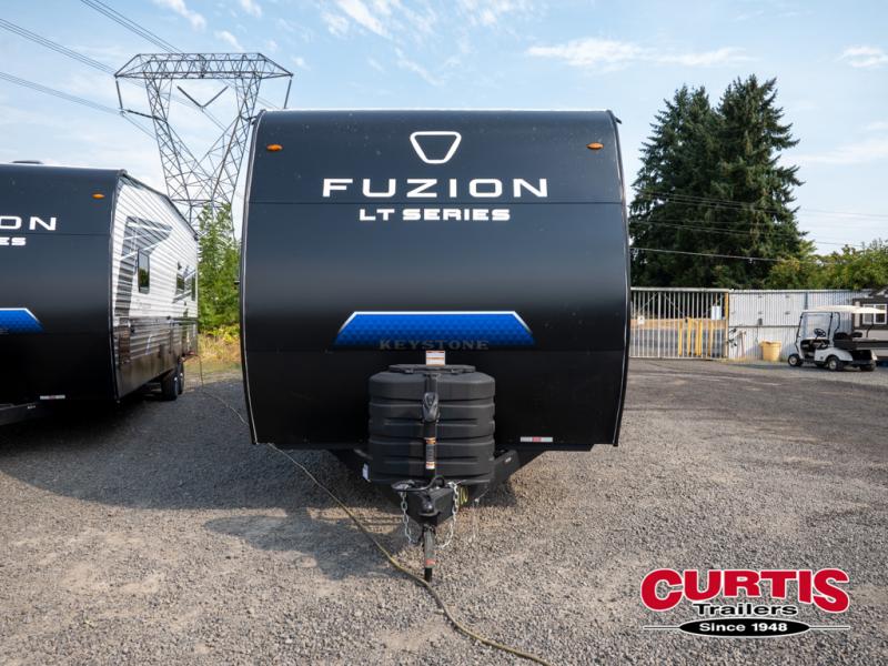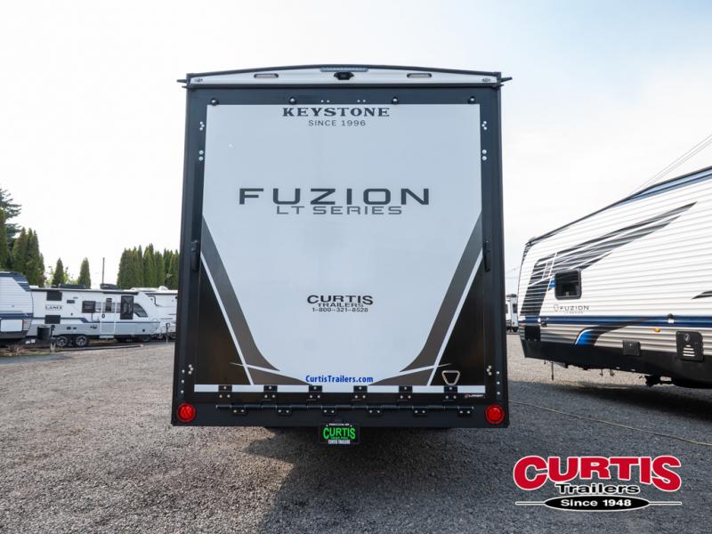 Embrace the great outdoors with a Fuzion Impact Edition toy hauler by Keystone! There is an aluminum exterior and a 8' 4" wide-body construction for your toys and gear! The one-piece polypropylene heated underbelly includes enclosed tanks and valves which will help extend your camping season, and the leaf spring suspension system will provide smooth towing. Head inside to enjoy night shades, hardwood cabinetry, and fiberglass backed linoleum floor with no carpet-free for easy cleaning. Each model also includes a Girard on-demand water heater, two 30 lb. LP tanks, recessed LED puck lighting throughout, and the list of comforts goes on!