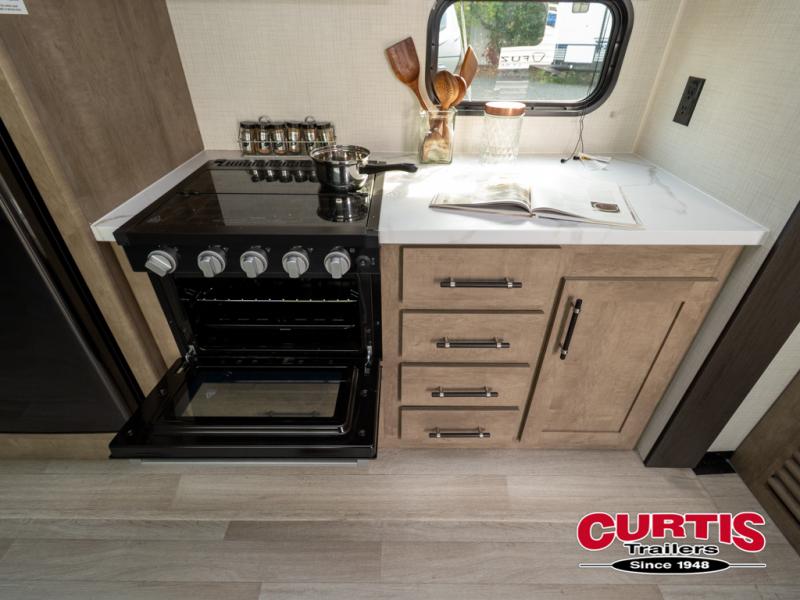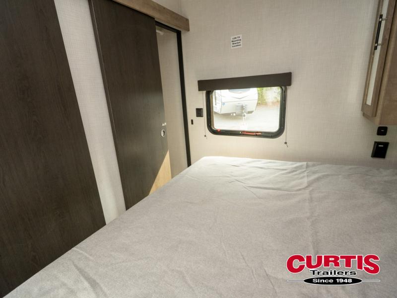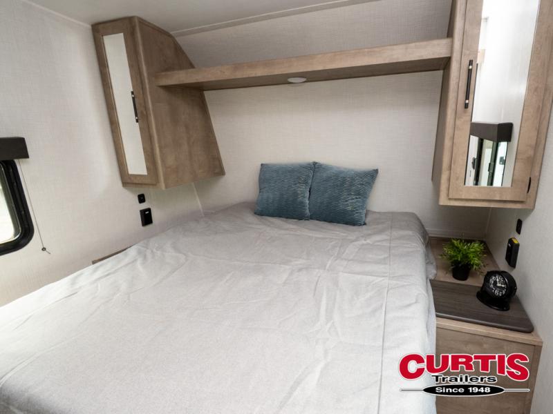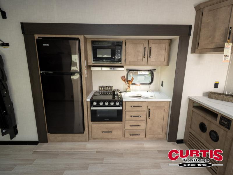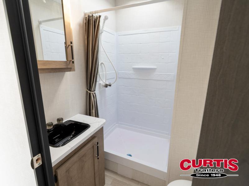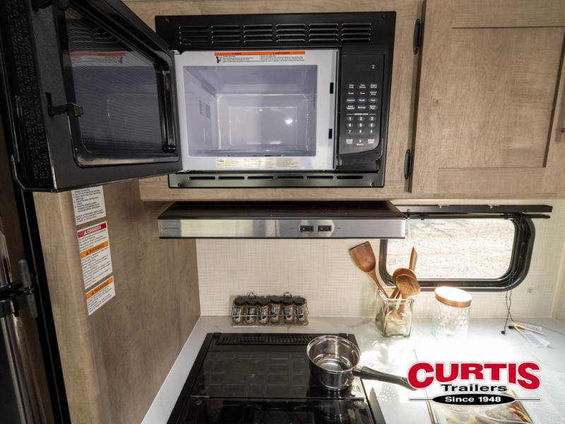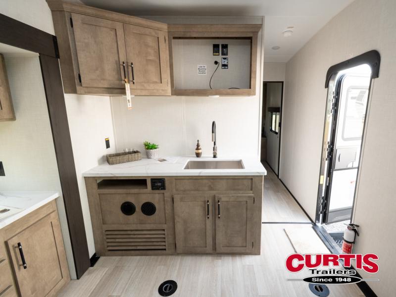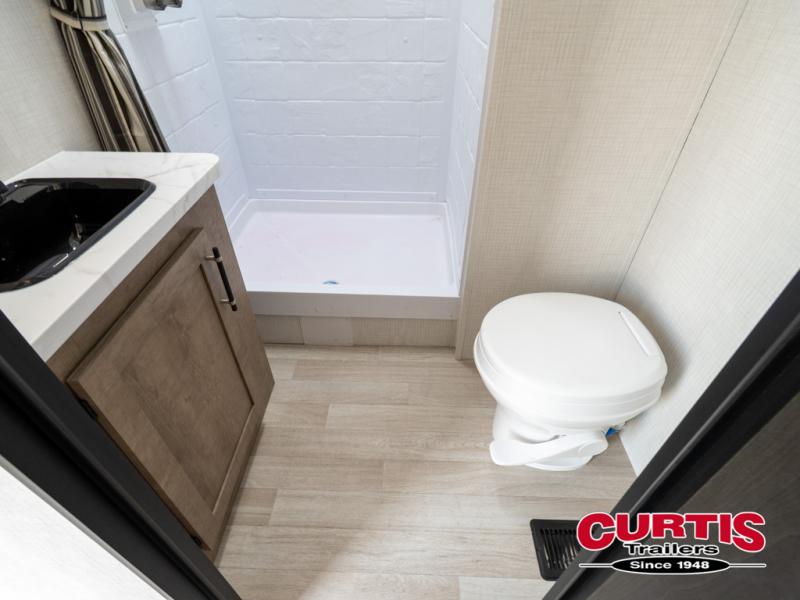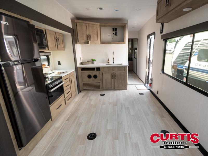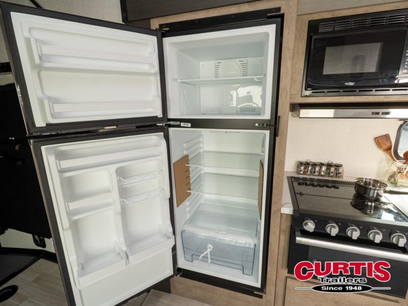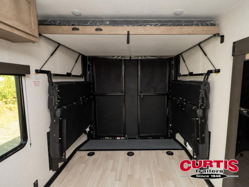 This open concept toy hauler is sure to meet all of your needs. There is a slide out for more space, a full kitchen with a Furrion three burner gas range and a microwave oven to prepare meals, plus a 10 cu. ft. 12V refrigerator to keep food fresh. You'll find comfortable seating space on the dual opposing sofas with a top queen bed, and there is TV prep if you want to add some entertainment. The RV queen bed in the front master bedroom will bring a great night's rest, and the full bath lets you clean up after trail riding. When you're ready to head home, the 15' garage area includes frame welded tie downs to keep your toys secure.