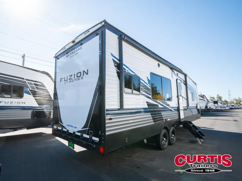 Embrace the great outdoors with a Fuzion Impact Edition toy hauler by Keystone! There is an aluminum exterior and a 8' 4" wide-body construction for your toys and gear! The one-piece polypropylene heated underbelly includes enclosed tanks and valves which will help extend your camping season, and the leaf spring suspension system will provide smooth towing. Head inside to enjoy night shades, hardwood cabinetry, and fiberglass backed linoleum floor with no carpet-free for easy cleaning. Each model also includes a Girard on-demand water heater, two 30 lb. LP tanks, recessed LED puck lighting throughout, and the list of comforts goes on!