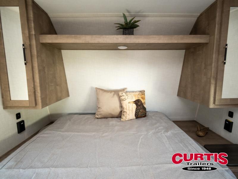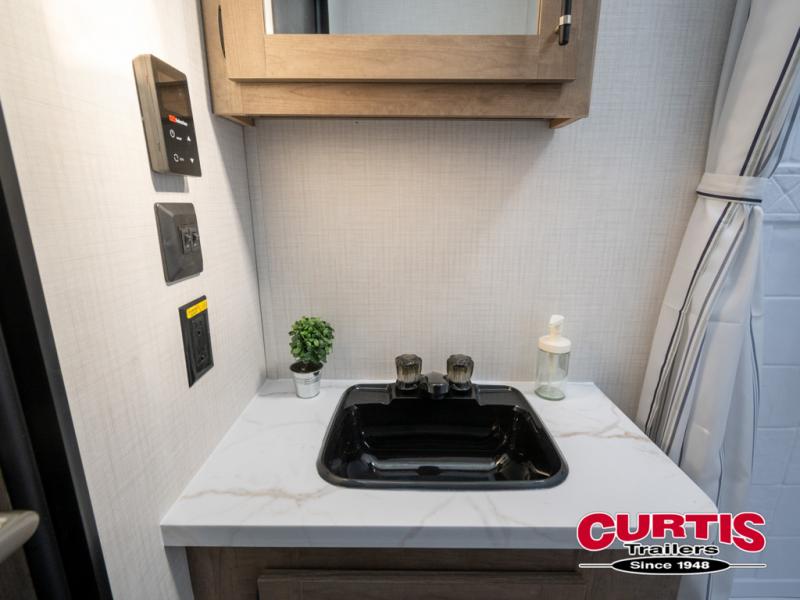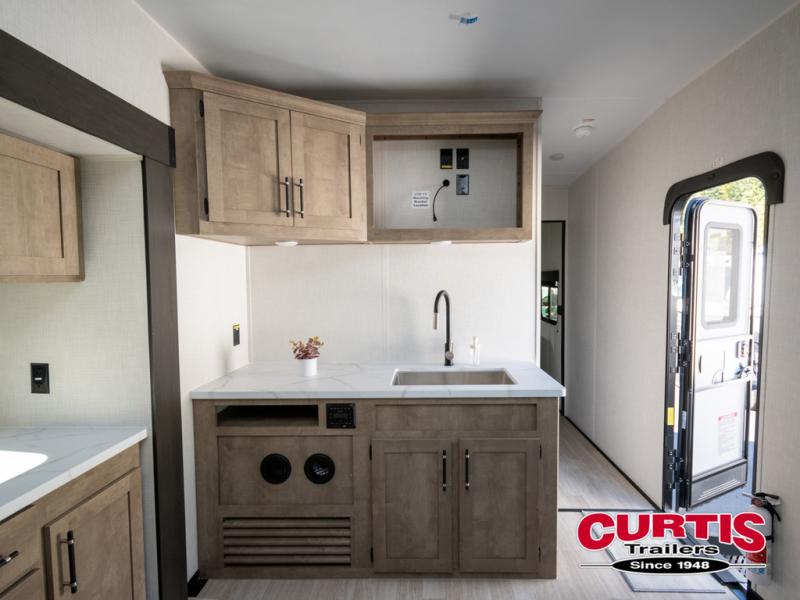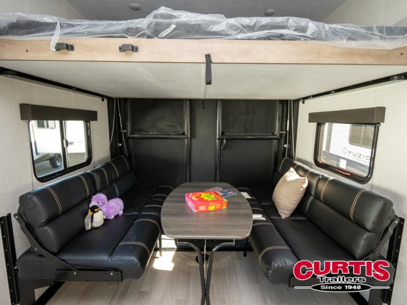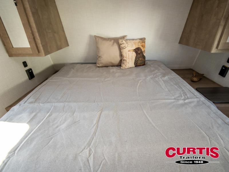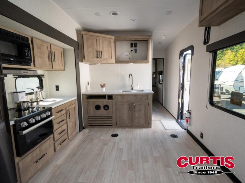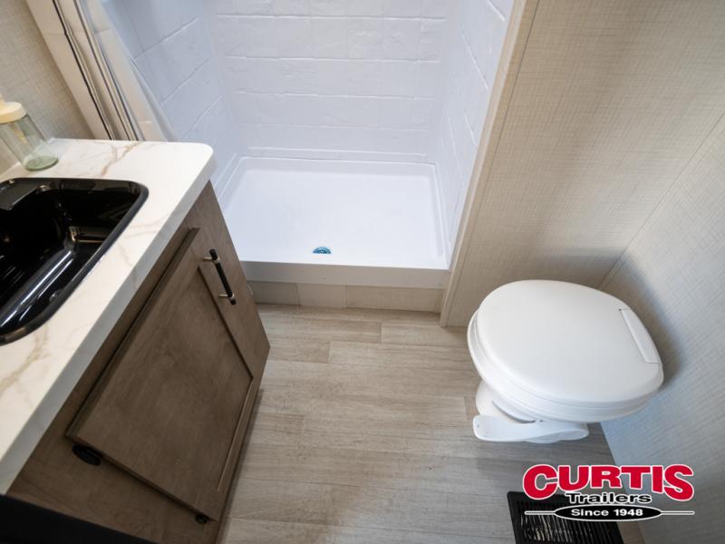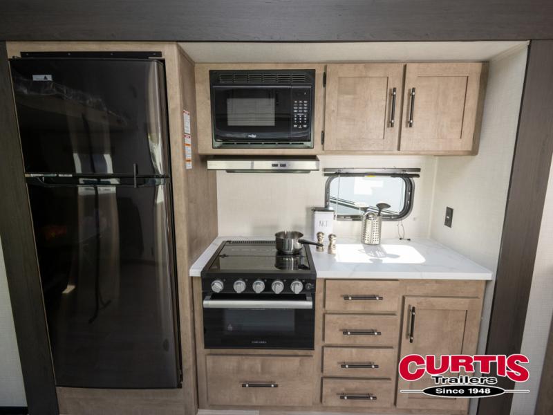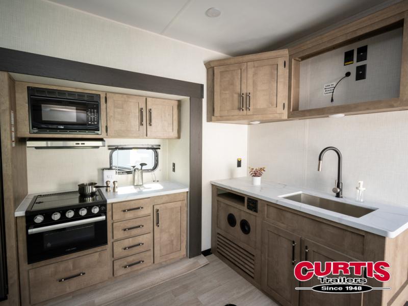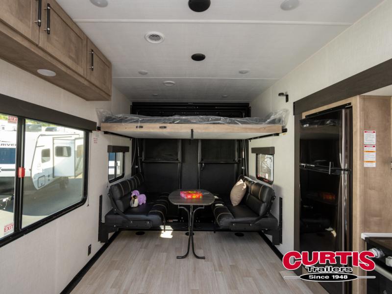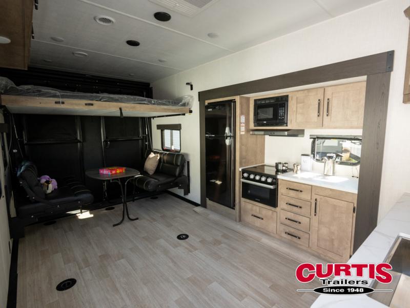 This open concept toy hauler is sure to meet all of your needs. There is a slide out for more space, a full kitchen with a Furrion three burner gas range and a microwave oven to prepare meals, plus a 10 cu. ft. 12V refrigerator to keep food fresh. You'll find comfortable seating space on the dual opposing sofas with a top queen bed, and there is TV prep if you want to add some entertainment. The RV queen bed in the front master bedroom will bring a great night's rest, and the full bath lets you clean up after trail riding. When you're ready to head home, the 15' garage area includes frame welded tie downs to keep your toys secure.