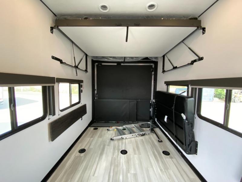 You'll love every minute camping in this spacious toy hauler! There are 5k lb. frame welded tie-downs to help keep your toys secure, and the 15' 8" garage area can easily transform to living and sleeping space. There is a sofa with a top queen bed here for guests, and a flip-up countertop with a window across the room that will be perfect to set your things on and enjoy the view. Head to the kitchen where you'll find a cooktop, a 12V refrigerator, and a second flip-up countertop with a fireplace below to make your space more cozy! The full bath towards the front will let you freshen up after a trail ride, and you're sure to appreciate having your own bedroom with a residential queen bed, dual nightstands, and a wardrobe for clothes!