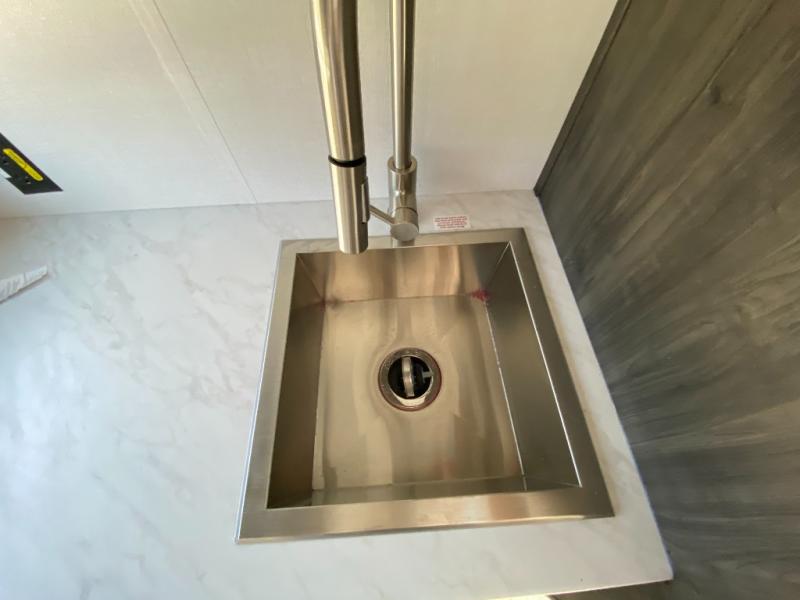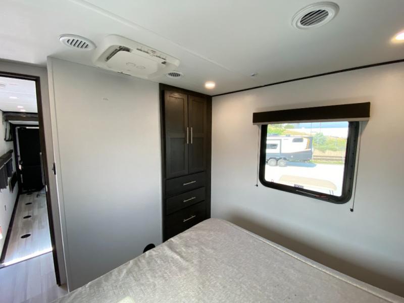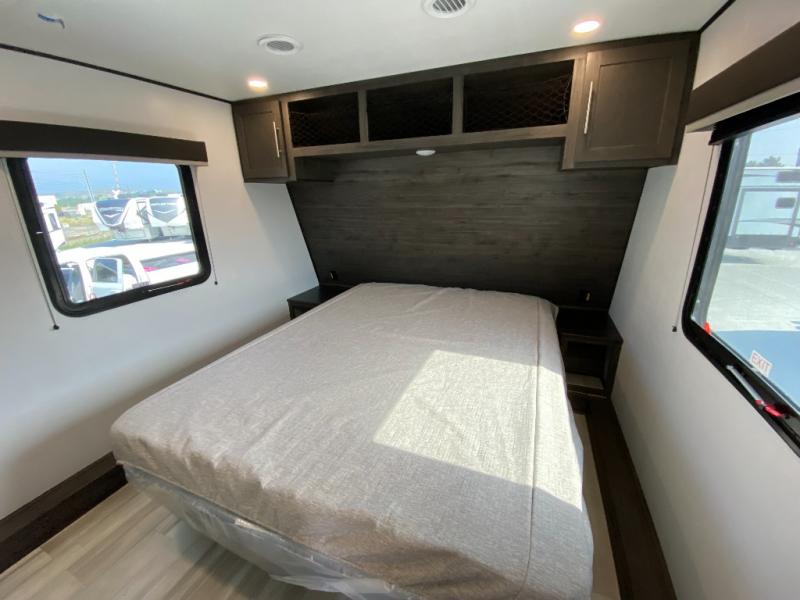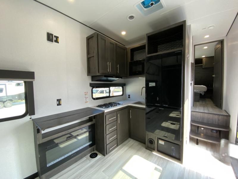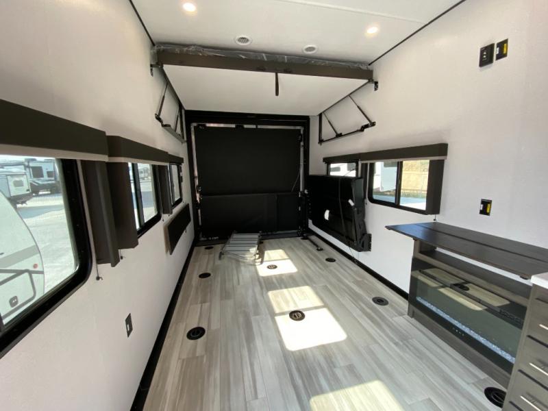 You'll love every minute camping in this spacious toy hauler! There are 5k lb. frame welded tie-downs to help keep your toys secure, and the 15' 8" garage area can easily transform to living and sleeping space. There is a sofa with a top queen bed here for guests, and a flip-up countertop with a window across the room that will be perfect to set your things on and enjoy the view. Head to the kitchen where you'll find a cooktop, a 12V refrigerator, and a second flip-up countertop with a fireplace below to make your space more cozy! The full bath towards the front will let you freshen up after a trail ride, and you're sure to appreciate having your own bedroom with a residential queen bed, dual nightstands, and a wardrobe for clothes!