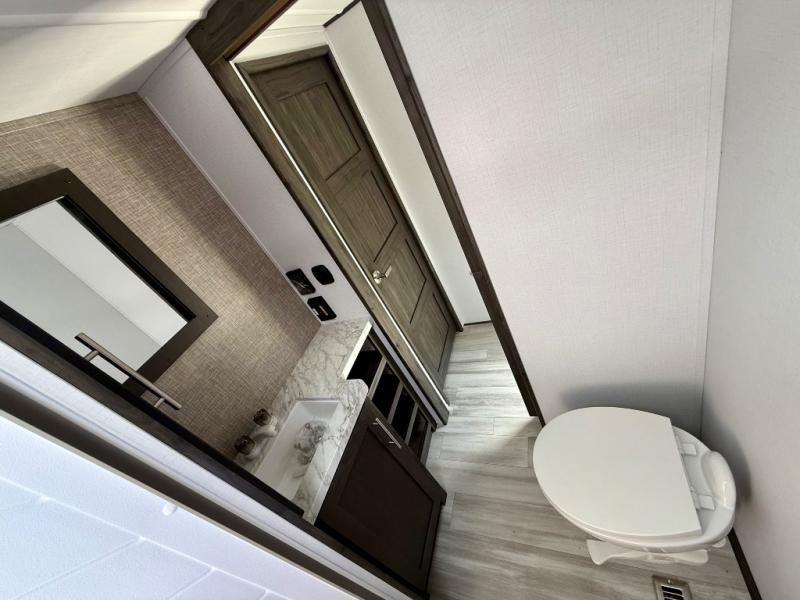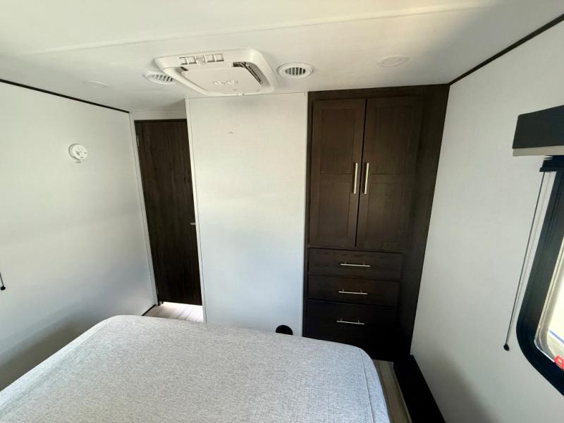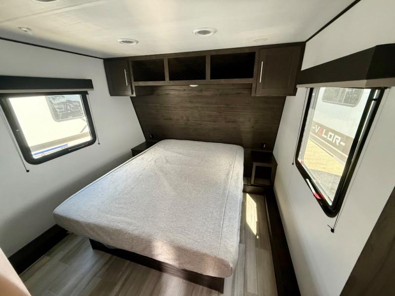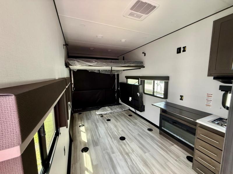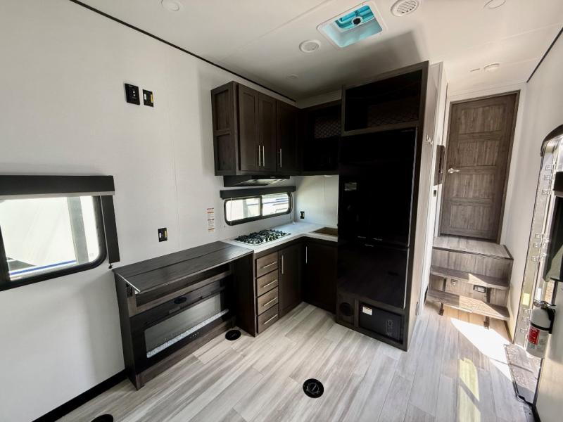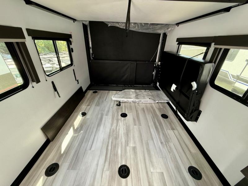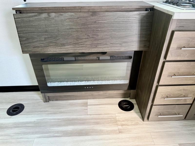 You'll love every minute camping in this spacious toy hauler! There are 5k lb. frame welded tie-downs to help keep your toys secure, and the 15' 8" garage area can easily transform to living and sleeping space. There is a sofa with a top queen bed here for guests, and a flip-up countertop with a window across the room that will be perfect to set your things on and enjoy the view. Head to the kitchen where you'll find a cooktop, a 12V refrigerator, and a second flip-up countertop with a fireplace below to make your space more cozy! The full bath towards the front will let you freshen up after a trail ride, and you're sure to appreciate having your own bedroom with a residential queen bed, dual nightstands, and a wardrobe for clothes!