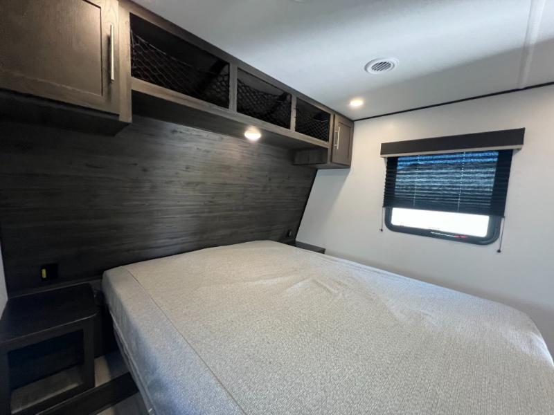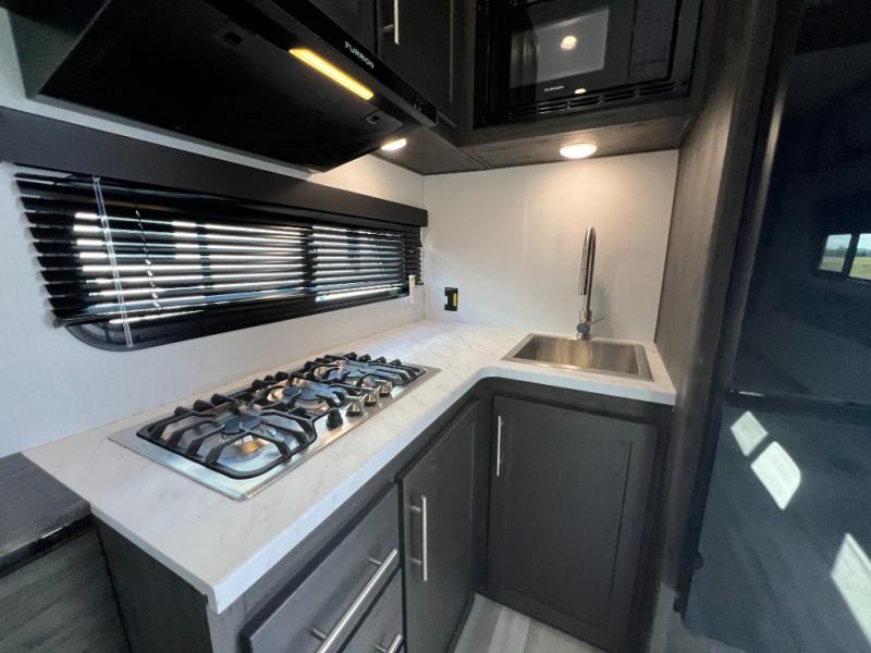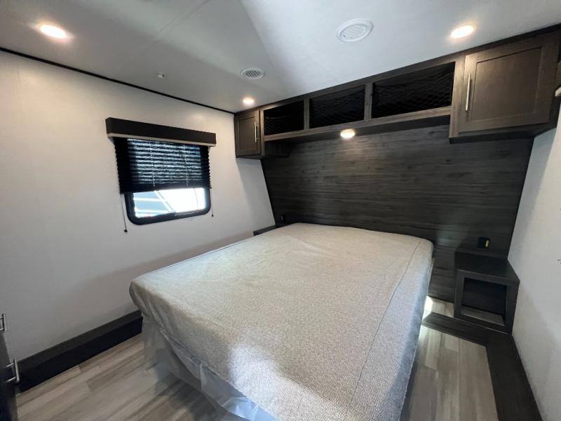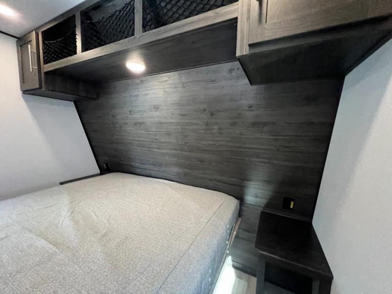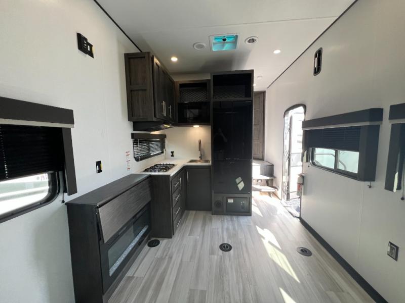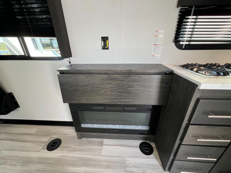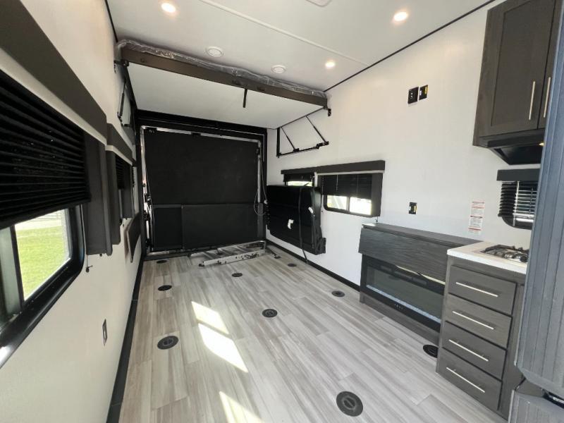 You'll love every minute camping in this spacious toy hauler! There are 5k lb. frame welded tie-downs to help keep your toys secure, and the 15' 8" garage area can easily transform to living and sleeping space. There is a sofa with a top queen bed here for guests, and a flip-up countertop with a window across the room that will be perfect to set your things on and enjoy the view. Head to the kitchen where you'll find a cooktop, a 12V refrigerator, and a second flip-up countertop with a fireplace below to make your space more cozy! The full bath towards the front will let you freshen up after a trail ride, and you're sure to appreciate having your own bedroom with a residential queen bed, dual nightstands, and a wardrobe for clothes!