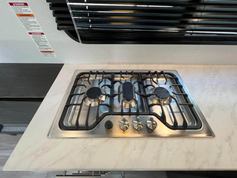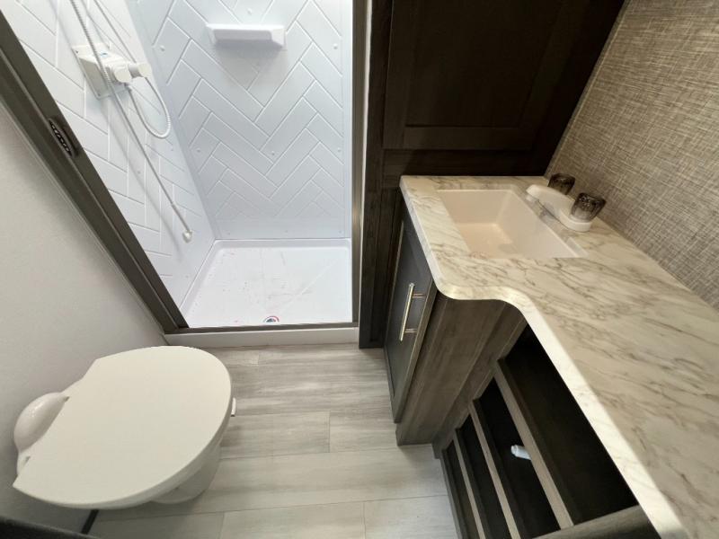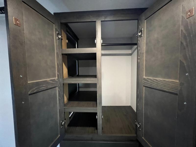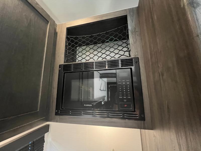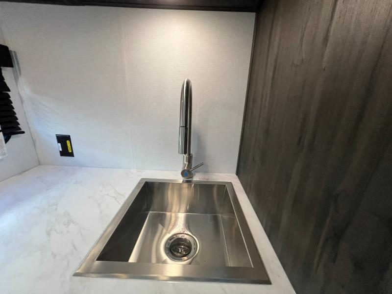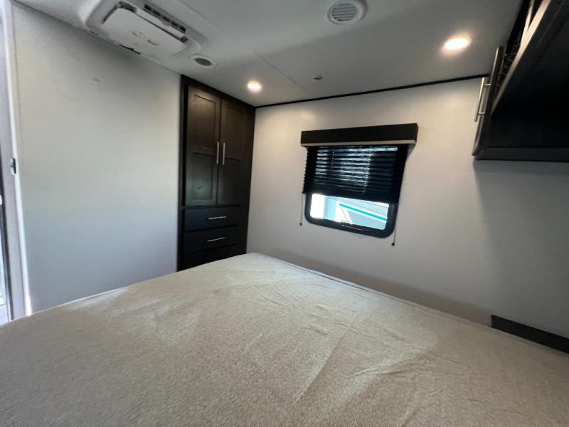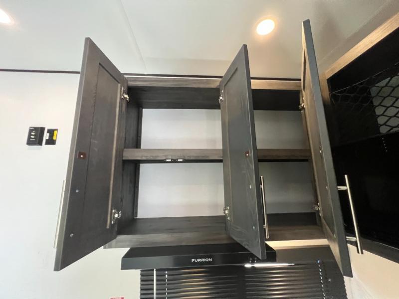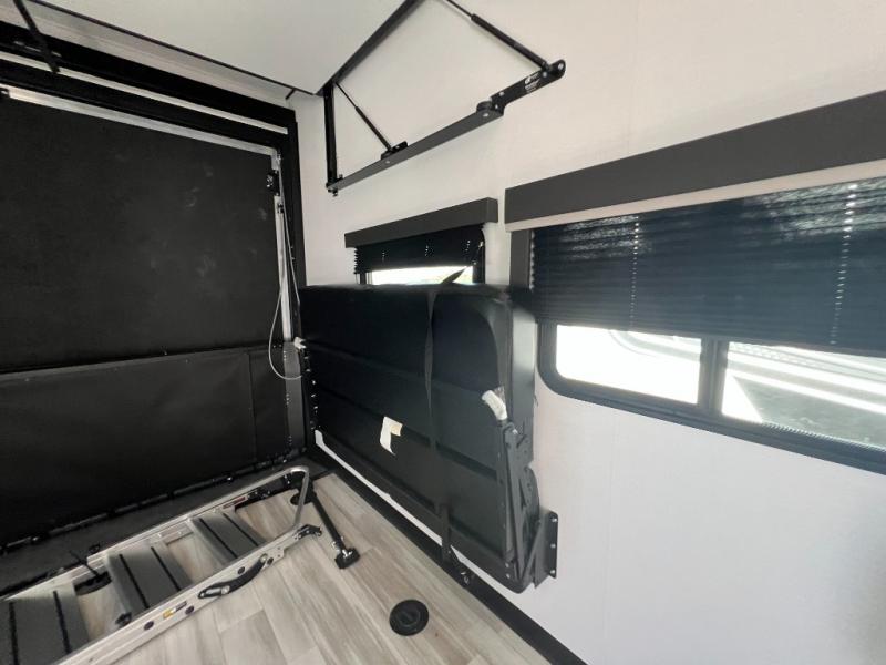 You'll love every minute camping in this spacious toy hauler! There are 5k lb. frame welded tie-downs to help keep your toys secure, and the 15' 8" garage area can easily transform to living and sleeping space. There is a sofa with a top queen bed here for guests, and a flip-up countertop with a window across the room that will be perfect to set your things on and enjoy the view. Head to the kitchen where you'll find a cooktop, a 12V refrigerator, and a second flip-up countertop with a fireplace below to make your space more cozy! The full bath towards the front will let you freshen up after a trail ride, and you're sure to appreciate having your own bedroom with a residential queen bed, dual nightstands, and a wardrobe for clothes!