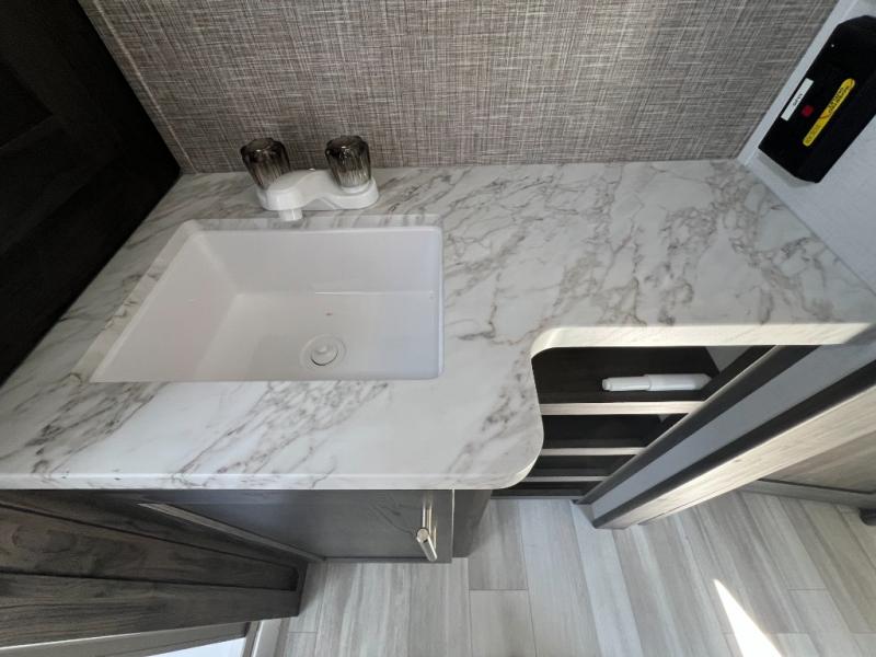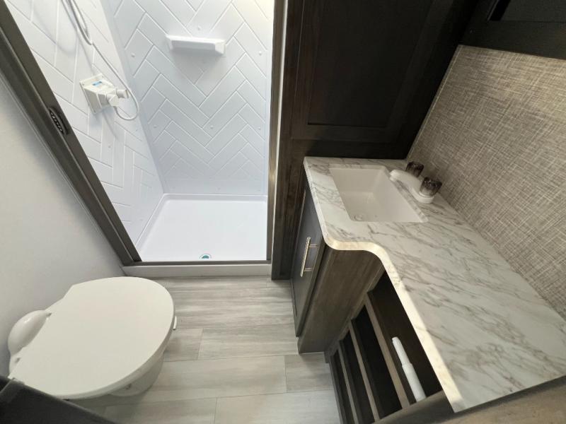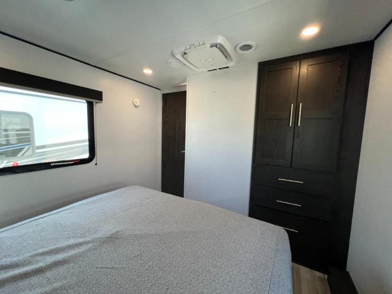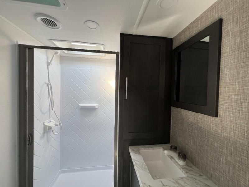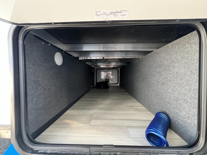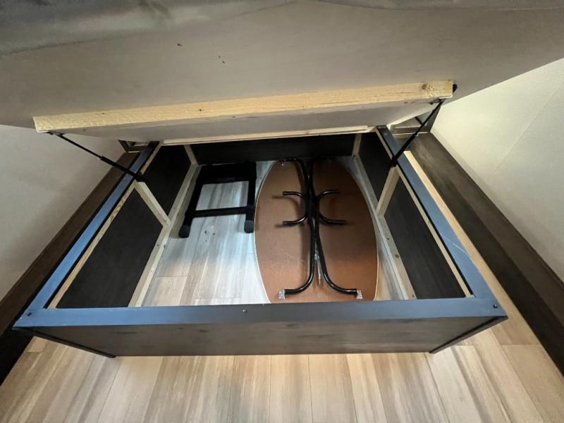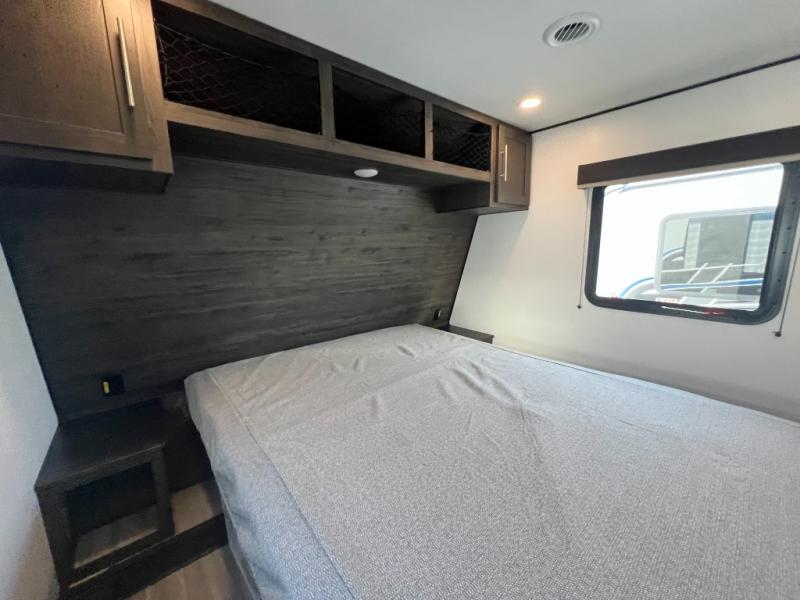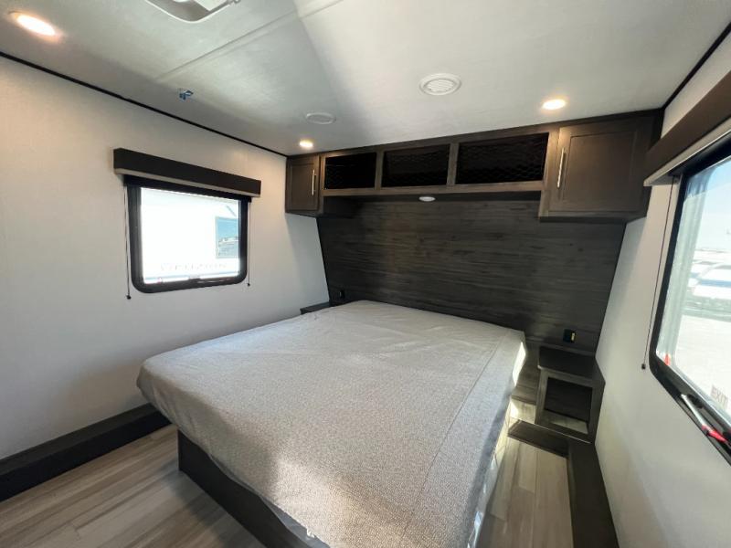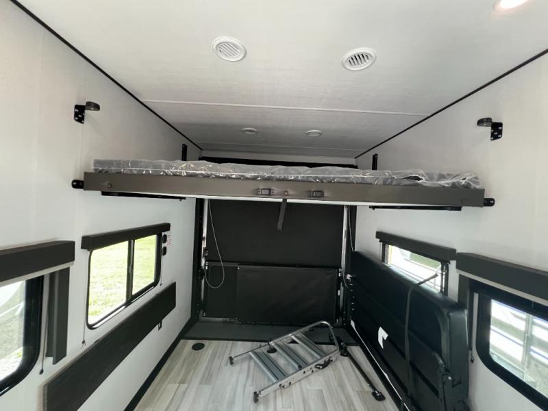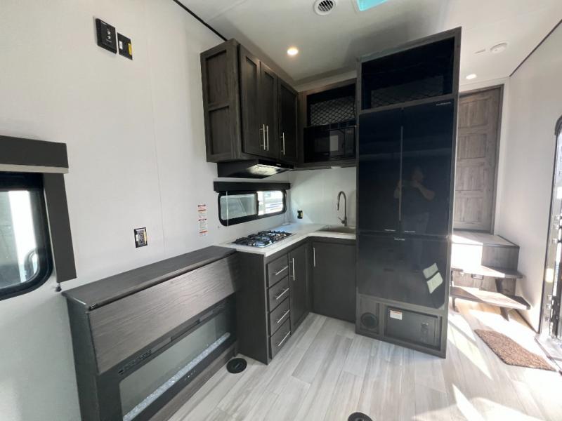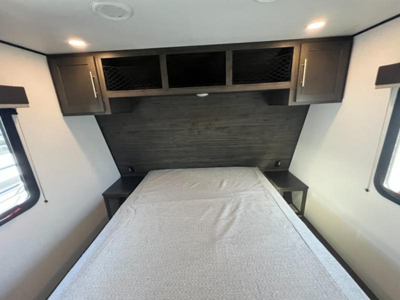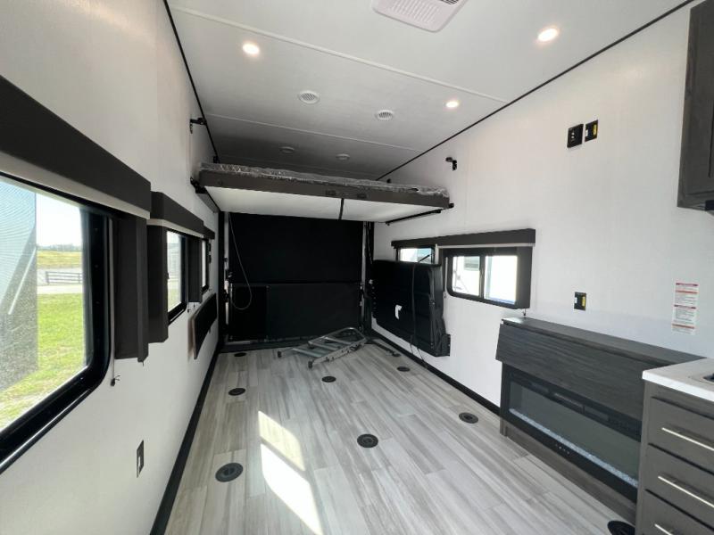 You'll love every minute camping in this spacious toy hauler! There are 5k lb. frame welded tie-downs to help keep your toys secure, and the 15' 8" garage area can easily transform to living and sleeping space. There is a sofa with a top queen bed here for guests, and a flip-up countertop with a window across the room that will be perfect to set your things on and enjoy the view. Head to the kitchen where you'll find a cooktop, a 12V refrigerator, and a second flip-up countertop with a fireplace below to make your space more cozy! The full bath towards the front will let you freshen up after a trail ride, and you're sure to appreciate having your own bedroom with a residential queen bed, dual nightstands, and a wardrobe for clothes!