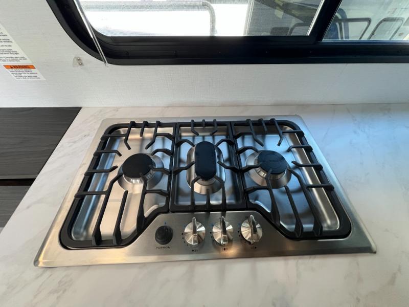 Embrace the great outdoors with a Fuzion Impact Edition toy hauler by Keystone! There are laminated fiberglass sidewalls and a 8' 4" wide-body construction for your toys and gear! The one-piece polypropylene heated underbelly includes enclosed tanks and valves which will help extend your camping season, and the leaf spring suspension system will provide smooth towing. Head inside to enjoy night shades, hardwood cabinetry, and fiberglass backed linoleum floor with no carpet for easy cleaning. Each model also includes a Girard on-demand water heater, two 30 lb. LP tanks, recessed LED puck lighting throughout, and the list of comforts goes on!