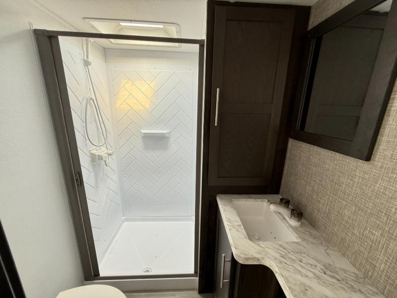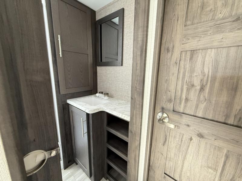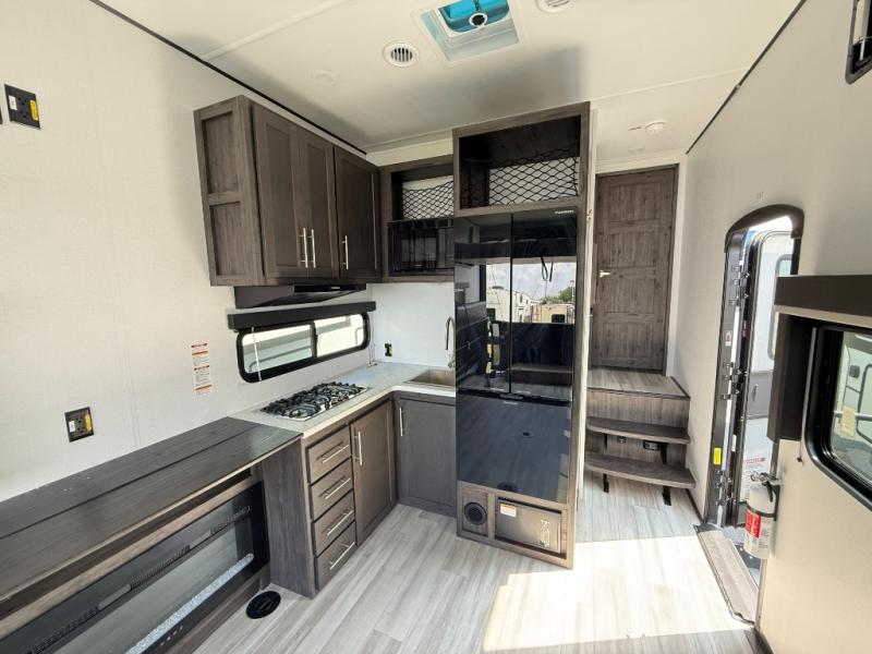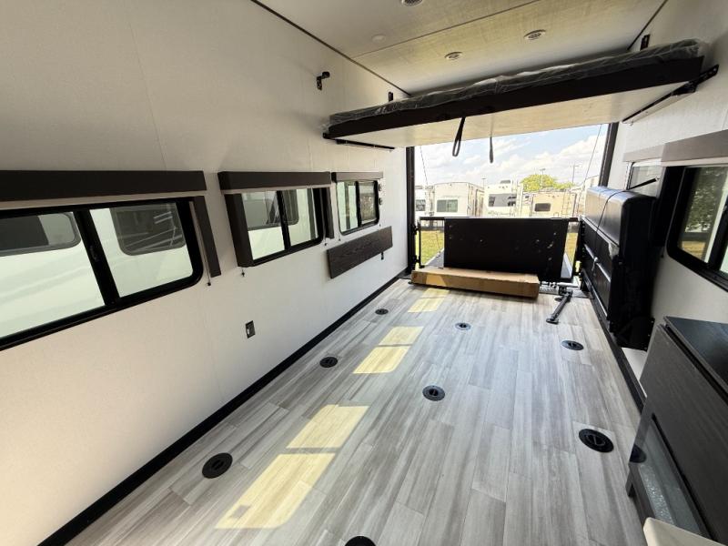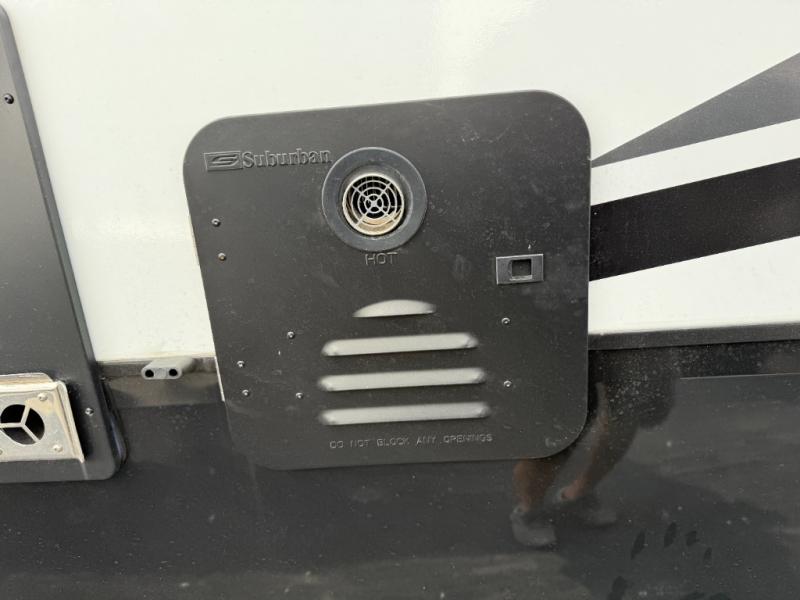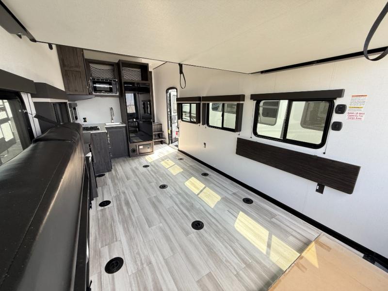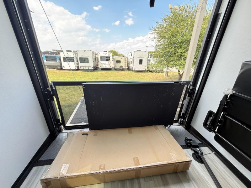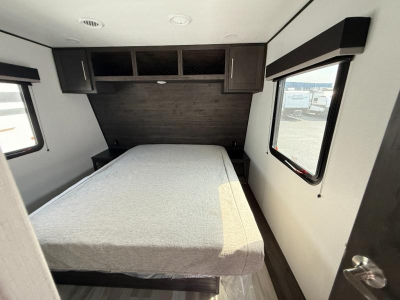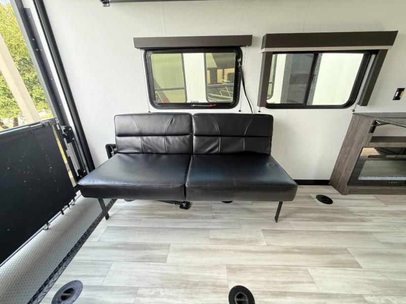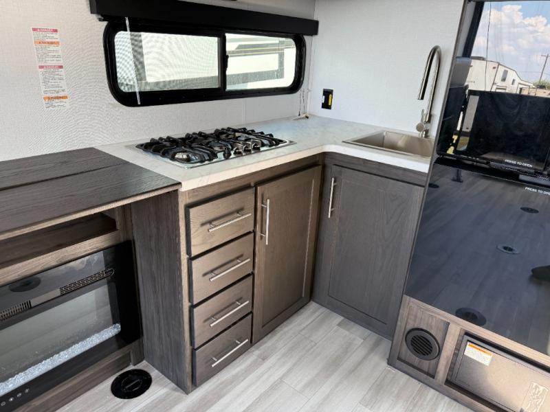 You'll love every minute camping in this spacious toy hauler! There are 5k lb. frame welded tie-downs to help keep your toys secure, and the 15' 8" garage area can easily transform to living and sleeping space. There is a sofa with a top queen bed here for guests, and a flip-up countertop with a window across the room that will be perfect to set your things on and enjoy the view. Head to the kitchen where you'll find a cooktop, a 12V refrigerator, and a second flip-up countertop with a fireplace below to make your space more cozy! The full bath towards the front will let you freshen up after a trail ride, and you're sure to appreciate having your own bedroom with a residential queen bed, dual nightstands, and a wardrobe for clothes!