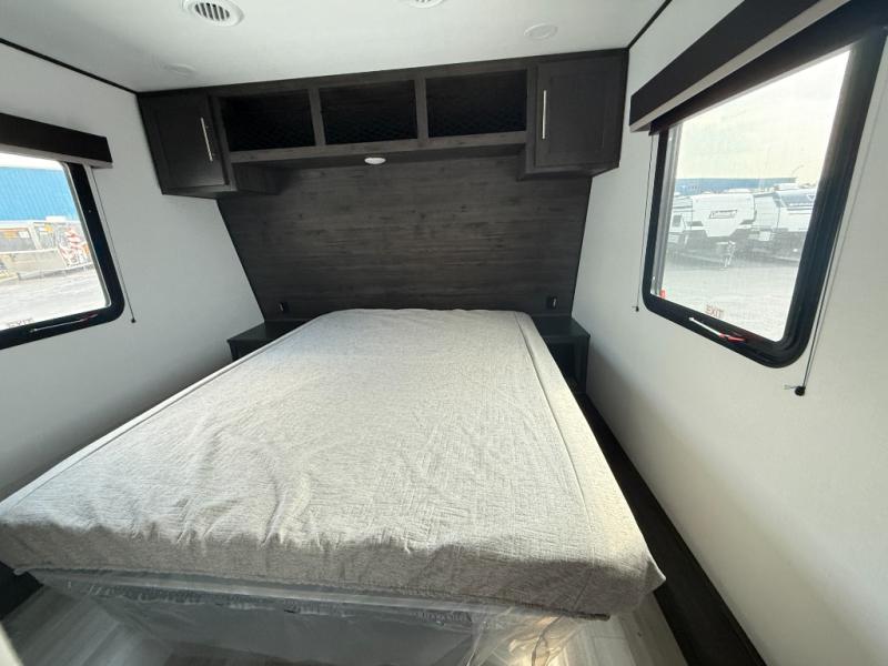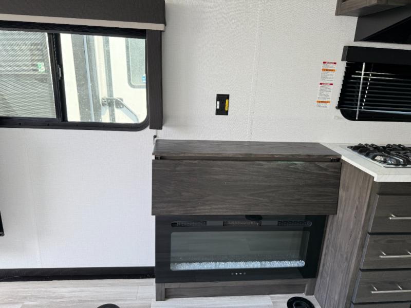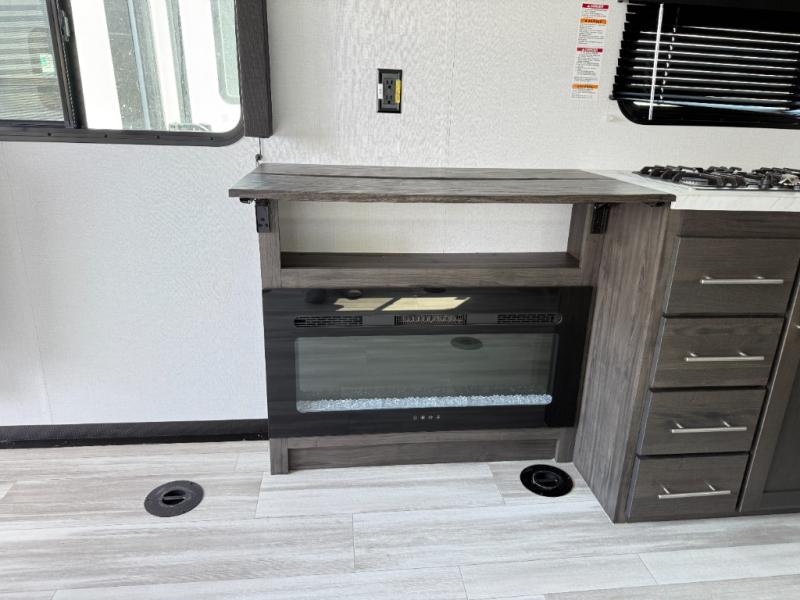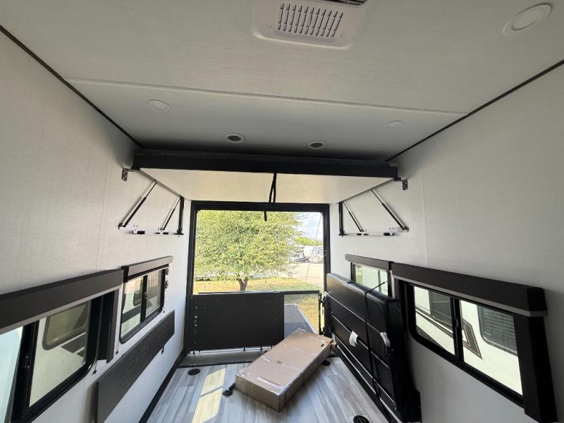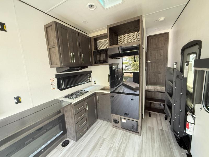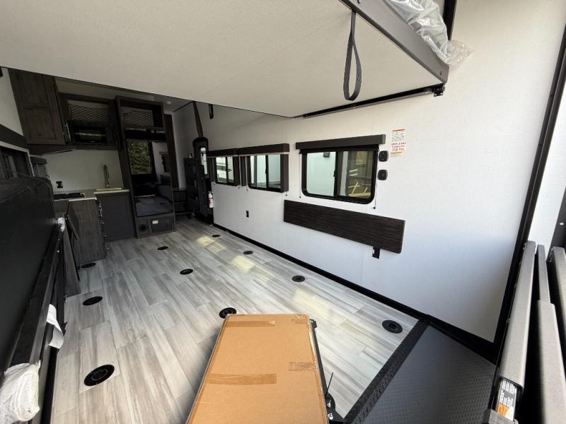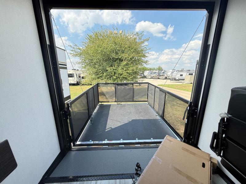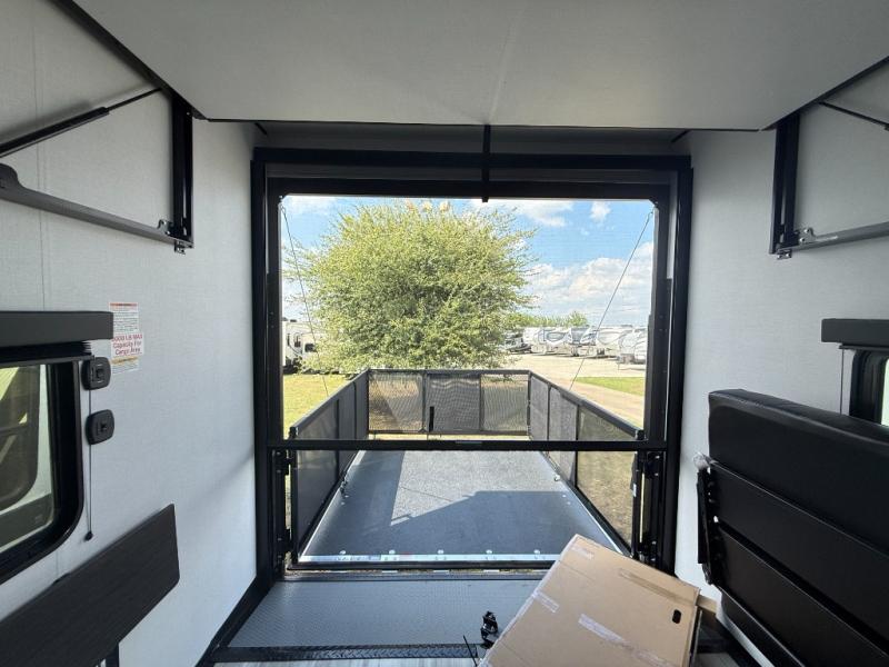 You'll love every minute camping in this spacious toy hauler! There are 5k lb. frame welded tie-downs to help keep your toys secure, and the 15' 8" garage area can easily transform to living and sleeping space. There is a sofa with a top queen bed here for guests, and a flip-up countertop with a window across the room that will be perfect to set your things on and enjoy the view. Head to the kitchen where you'll find a cooktop, a 12V refrigerator, and a second flip-up countertop with a fireplace below to make your space more cozy! The full bath towards the front will let you freshen up after a trail ride, and you're sure to appreciate having your own bedroom with a residential queen bed, dual nightstands, and a wardrobe for clothes!