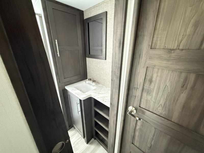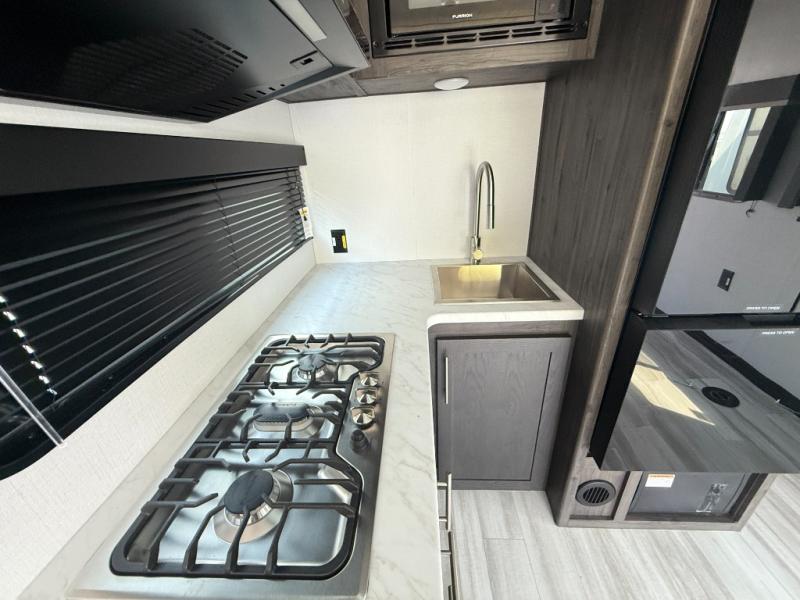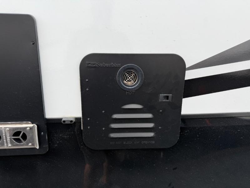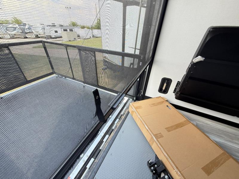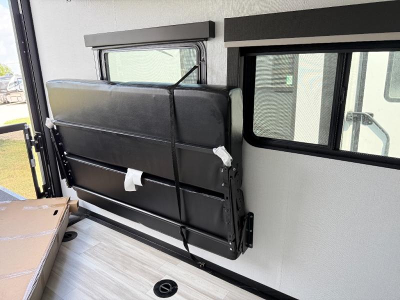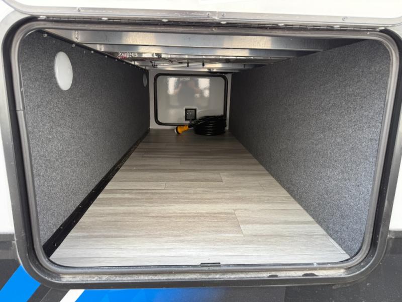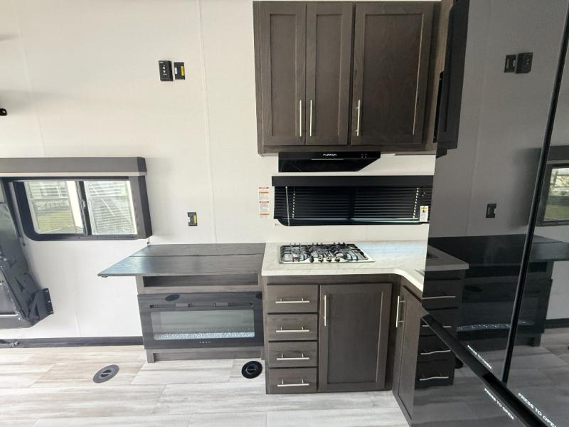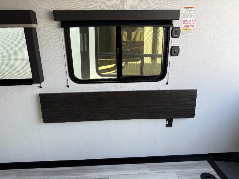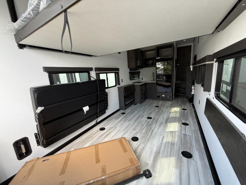 You'll love every minute camping in this spacious toy hauler! There are 5k lb. frame welded tie-downs to help keep your toys secure, and the 15' 8" garage area can easily transform to living and sleeping space. There is a sofa with a top queen bed here for guests, and a flip-up countertop with a window across the room that will be perfect to set your things on and enjoy the view. Head to the kitchen where you'll find a cooktop, a 12V refrigerator, and a second flip-up countertop with a fireplace below to make your space more cozy! The full bath towards the front will let you freshen up after a trail ride, and you're sure to appreciate having your own bedroom with a residential queen bed, dual nightstands, and a wardrobe for clothes!