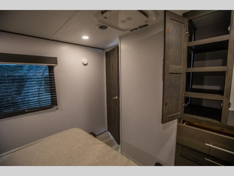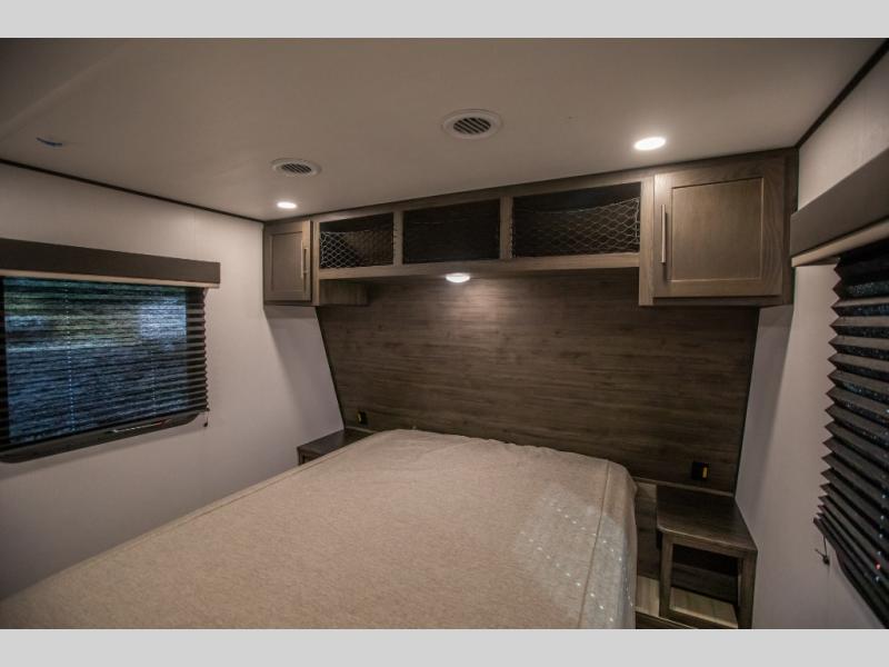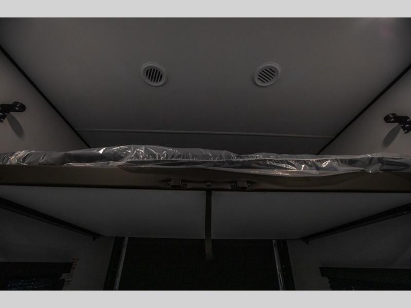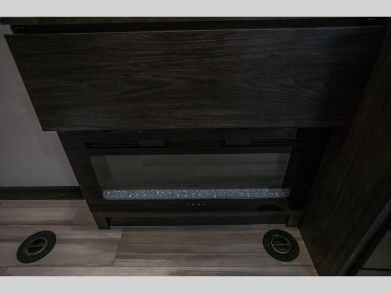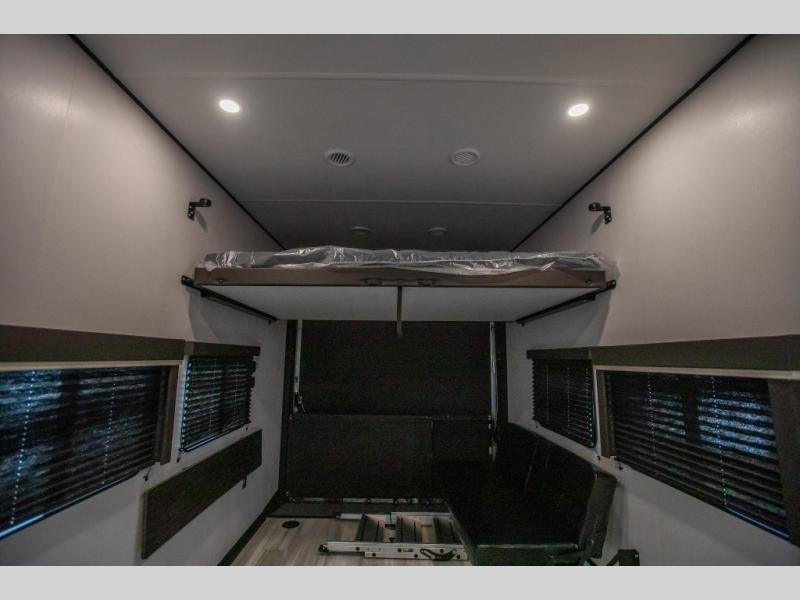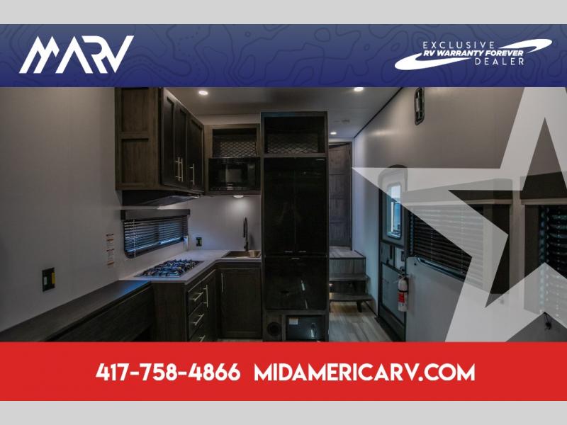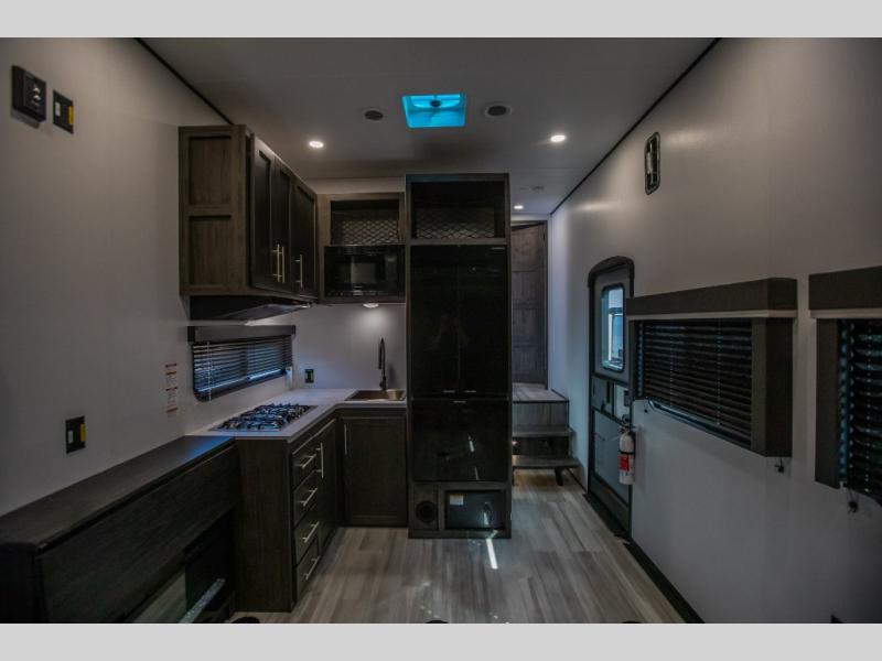You'll love every minute camping in this spacious toy hauler! There are 5k lb. frame welded tie-downs to help keep your toys secure, and the 15' 8" garage area can easily transform to living and sleeping space. There is a sofa with a top queen bed here for guests, and a flip-up countertop with a window across the room will be perfect to set your things on and enjoy the view. Head to the kitchen where you'll find a cooktop, a 12V refrigerator, and a second flip-up countertop with a fireplace below to make your space more cozy! The full bath towards the front will let you freshen up after a trail ride, and you're sure to appreciate having your own bedroom with residential queen bed, dual nightstands, and a wardrobe for clothes!