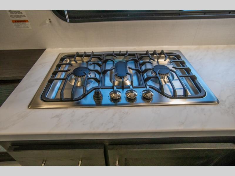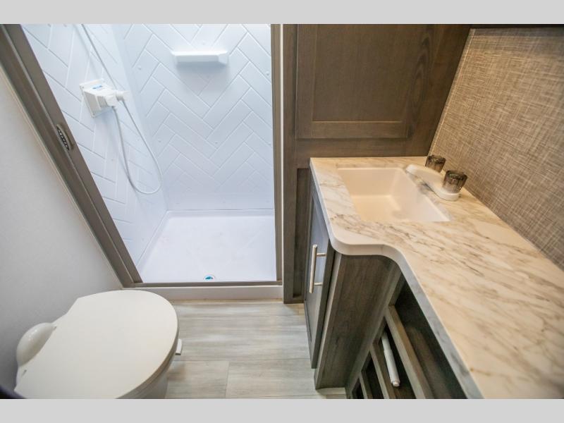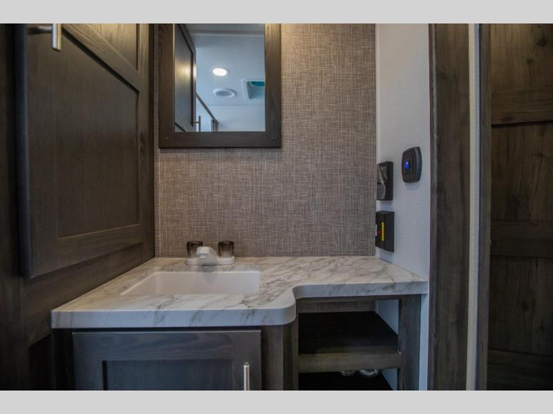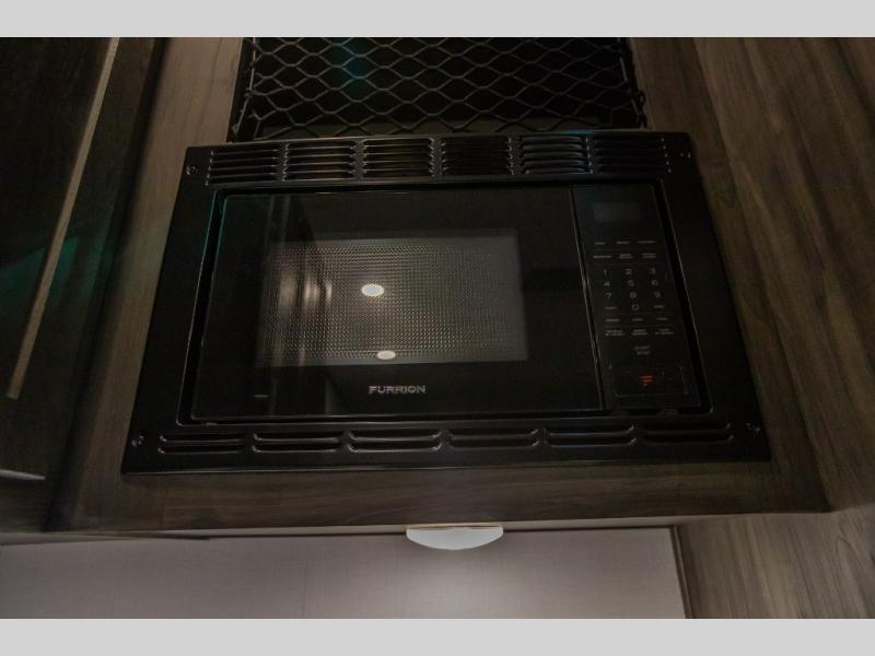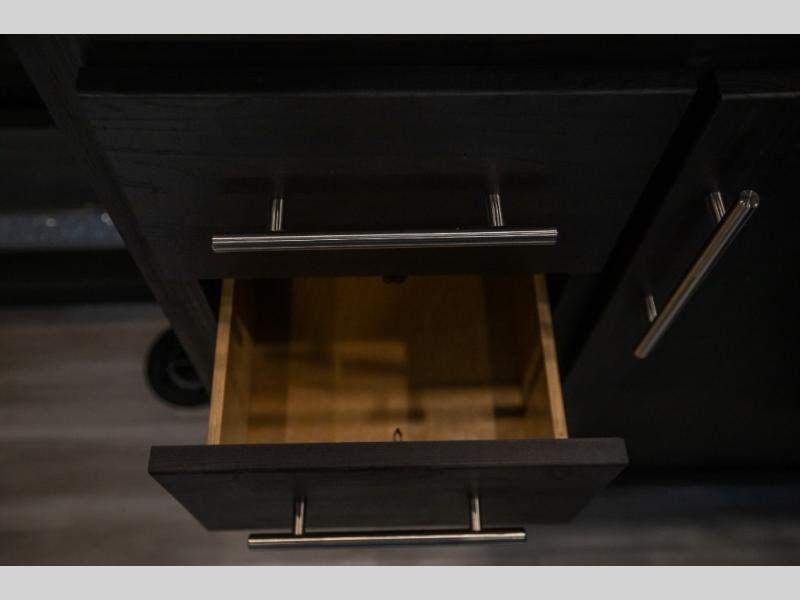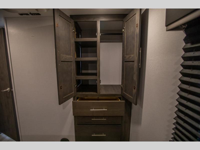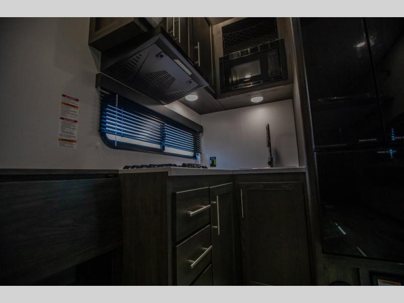 You'll love every minute camping in this spacious toy hauler! There are 5k lb. frame welded tie-downs to help keep your toys secure, and the 15' 8" garage area can easily transform to living and sleeping space. There is a sofa with a top queen bed here for guests, and a flip-up countertop with a window across the room will be perfect to set your things on and enjoy the view. Head to the kitchen where you'll find a cooktop, a 12V refrigerator, and a second flip-up countertop with a fireplace below to make your space more cozy! The full bath towards the front will let you freshen up after a trail ride, and you're sure to appreciate having your own bedroom with residential queen bed, dual nightstands, and a wardrobe for clothes!