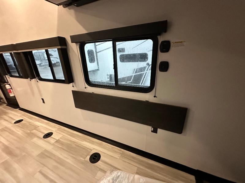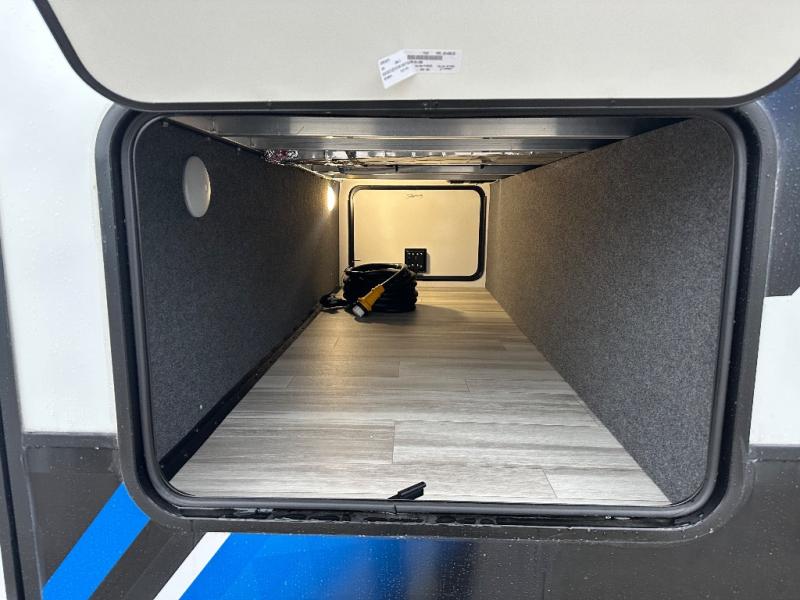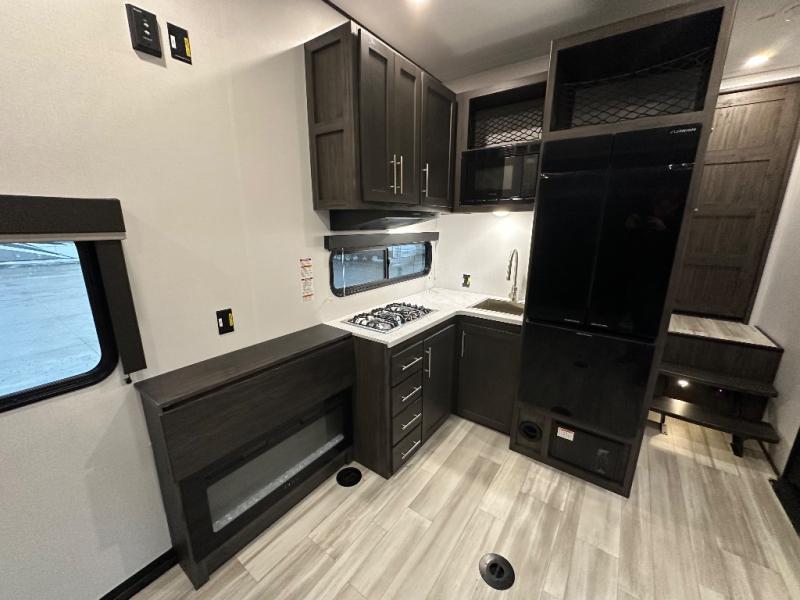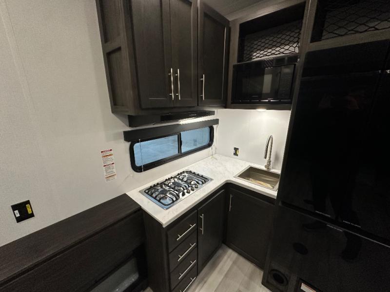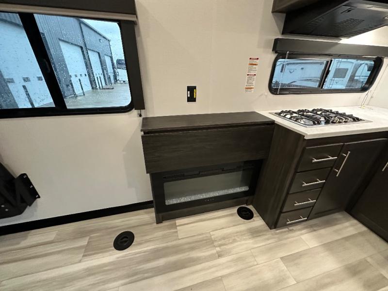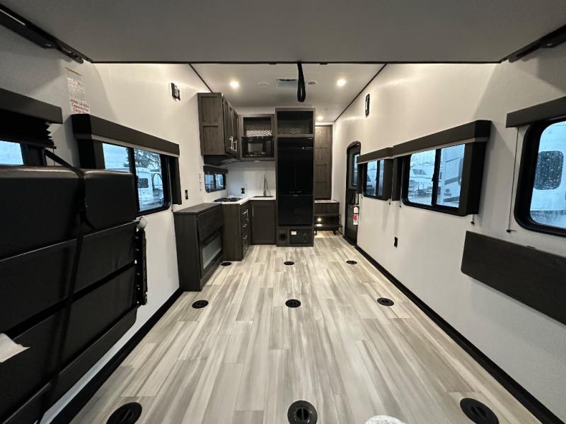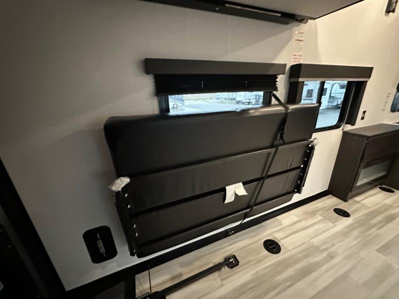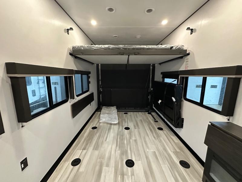 You'll love every minute camping in this spacious toy hauler! There are 5k lb. frame welded tie-downs to help keep your toys secure, and the 15' 8" garage area can easily transform to living and sleeping space. There is a sofa with a top queen bed here for guests, and a flip-up countertop with a window across the room that will be perfect to set your things on and enjoy the view. Head to the kitchen where you'll find a cooktop, a 12V refrigerator, and a second flip-up countertop with a fireplace below to make your space more cozy! The full bath towards the front will let you freshen up after a trail ride, and you're sure to appreciate having your own bedroom with a residential queen bed, dual nightstands, and a wardrobe for clothes!