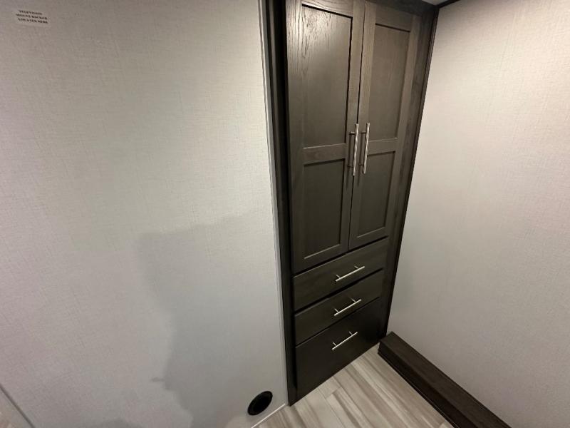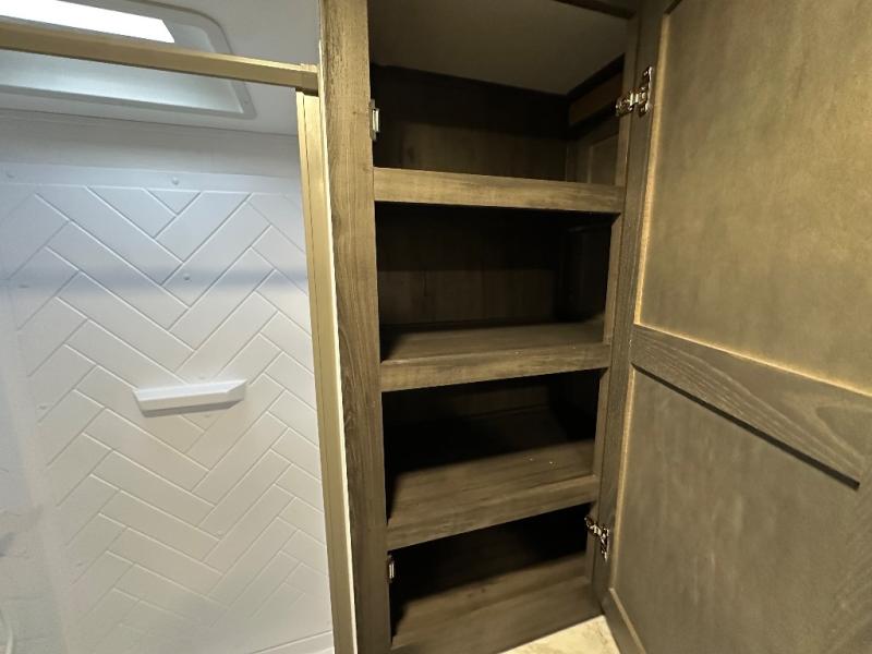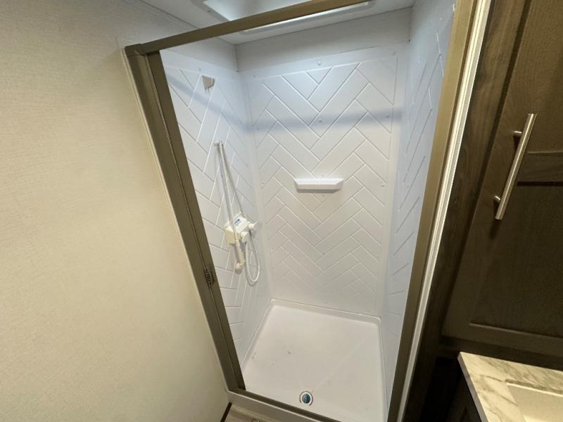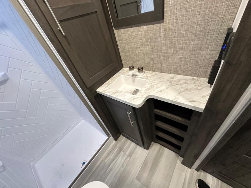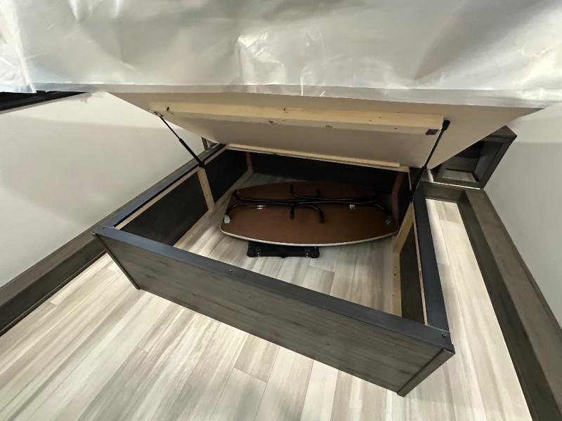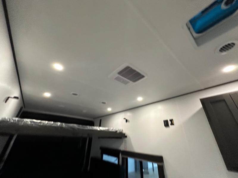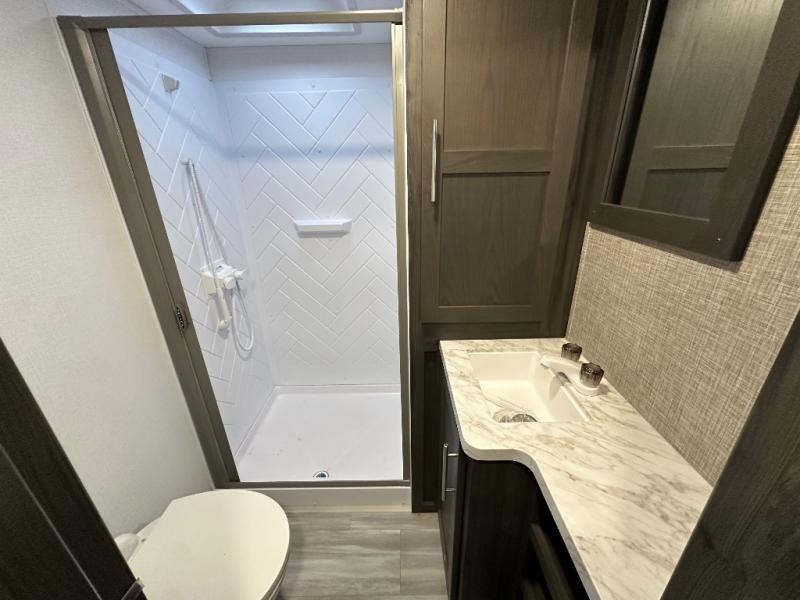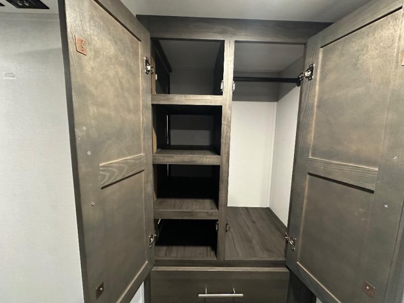 You'll love every minute camping in this spacious toy hauler! There are 5k lb. frame welded tie-downs to help keep your toys secure, and the 15' 8" garage area can easily transform to living and sleeping space. There is a sofa with a top queen bed here for guests, and a flip-up countertop with a window across the room that will be perfect to set your things on and enjoy the view. Head to the kitchen where you'll find a cooktop, a 12V refrigerator, and a second flip-up countertop with a fireplace below to make your space more cozy! The full bath towards the front will let you freshen up after a trail ride, and you're sure to appreciate having your own bedroom with a residential queen bed, dual nightstands, and a wardrobe for clothes!