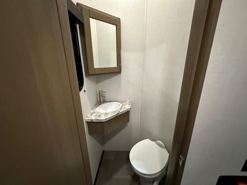 Fun with your toys is made easy with this 11' garage area toy hauler! Once the toys are unloaded, relax on the dual opposing sofas, or take a rest on the electric queen bed. The kids or guests can climb up into the loft that includes a bunk mat, and there is a half bath in the garage for added convenience. This model includes a peninsula countertop with plenty of space to prep meals and clean up, and there is a 16 cu. ft. 12V refrigerator for perishables. You'll find a residential shower with a seat in the dual entry bath, and the front bedroom will feel just like home with its king bed and wardrobe slide for all your clothes.