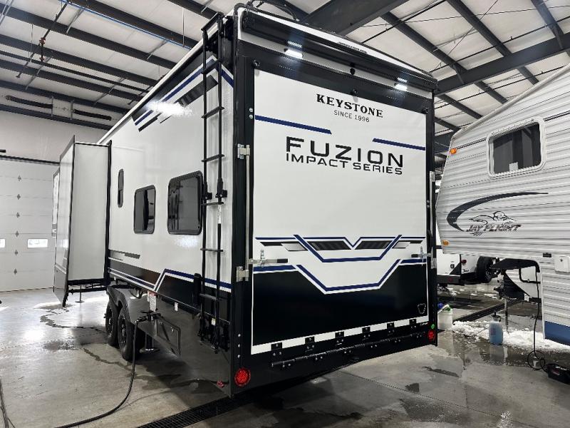 Embrace the great outdoors with a Fuzion Impact Edition toy hauler by Keystone! There are laminated fiberglass sidewalls and a 8' 4" wide-body construction for your toys and gear! The one-piece polypropylene heated underbelly includes enclosed tanks and valves which will help extend your camping season, and the leaf spring suspension system will provide smooth towing. Head inside to enjoy night shades, hardwood cabinetry, and fiberglass backed linoleum floor with no carpet for easy cleaning. Each model also includes a Girard on-demand water heater, two 30 lb. LP tanks, recessed LED puck lighting throughout, and the list of comforts goes on!