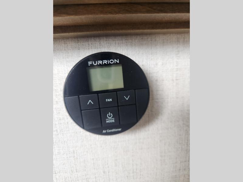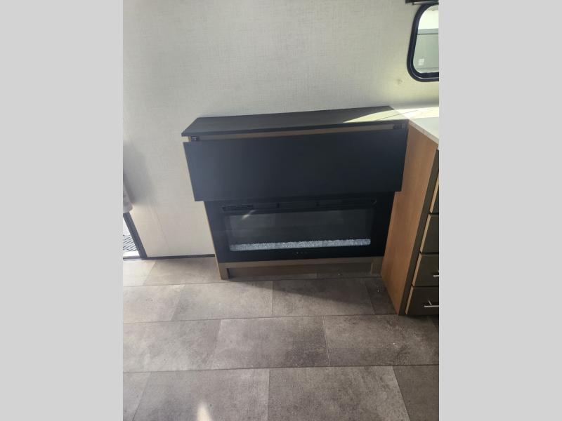 Living & Comfort: Carpet-free interior with hardwood cabinetry, night shades, and an electric fireplace for cozy nights.