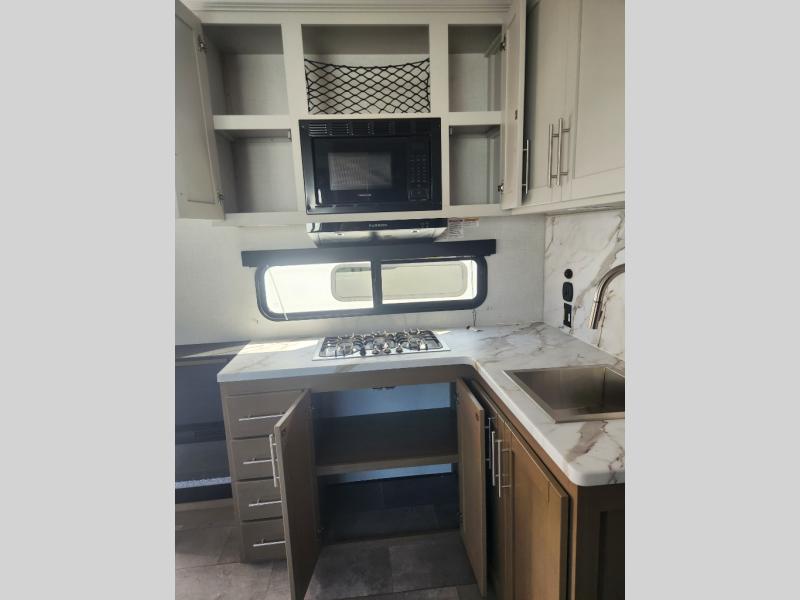 Kitchen: Functional kitchen with deep stainless-steel sink, 10 cu ft 12 V refrigerator, microwave, and Furrion three-burner range.