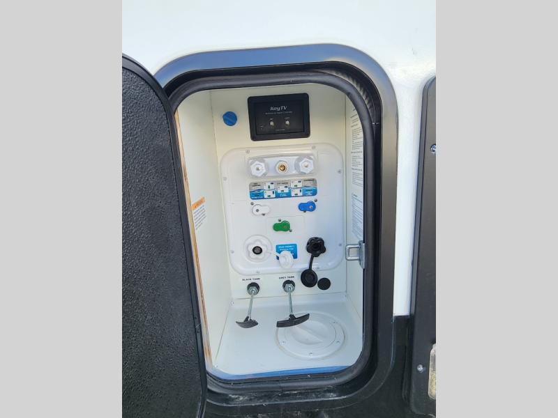 Utilities & Convenience: Generous tank capacities (e.g., ~94 gal fresh water), fuel station, exterior shower, 50-amp service, battery disconnect, and backup camera prep.