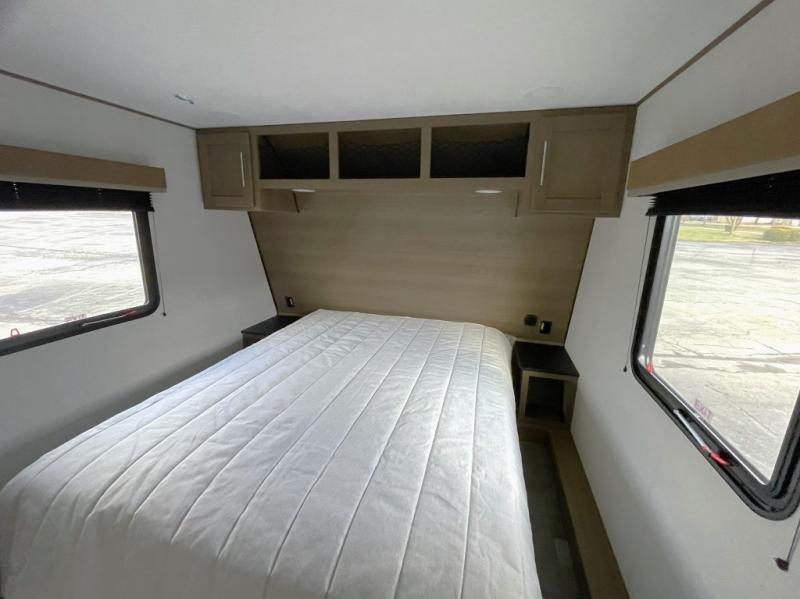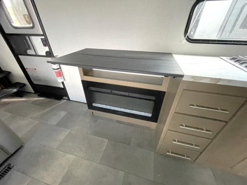 A carpet free layout, fiberglass backed linoleum, tall slide height, hardwood cabinetry, and night shades create a clean, modern look. A 5K BTU electric fireplace adds cozy ambiance, while in floor heating ducts and Tru Fit slide construction improve overall comfort and durability.