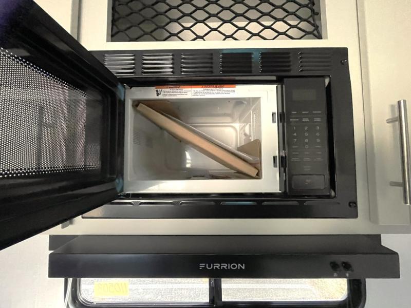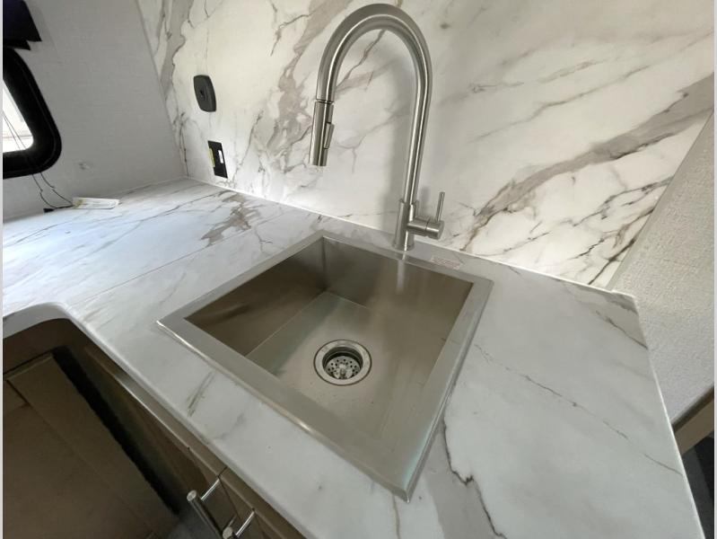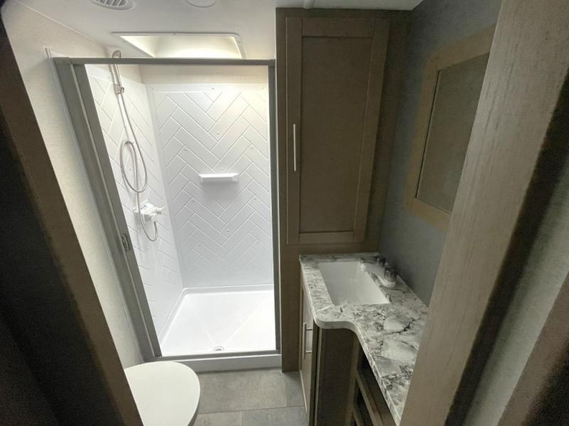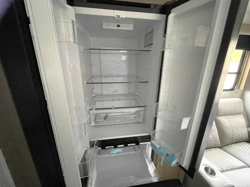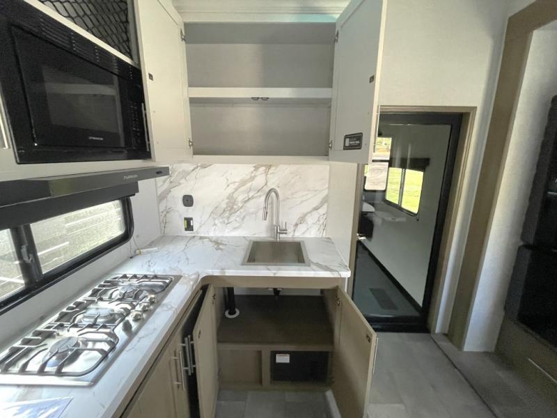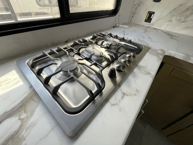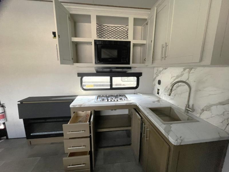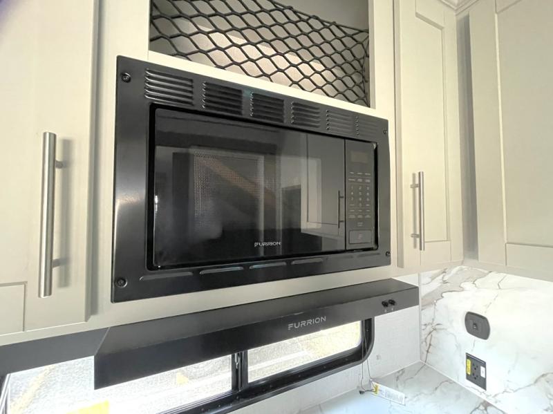 Prepare meals with ease using the deep stainless steel sink, high rise pull out sprayer faucet, 10 cu. ft. 12V refrigerator, microwave, and Furrion three burner range with low profile hood vent. Full extension drawer guides and LED lighting add residential ease.