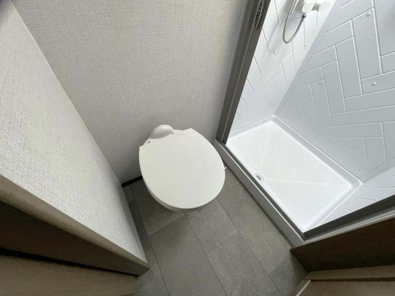 Enjoy larger bathroom amenities like an oversized shower with skylight, porcelain foot flush toilet, and pressed countertops.