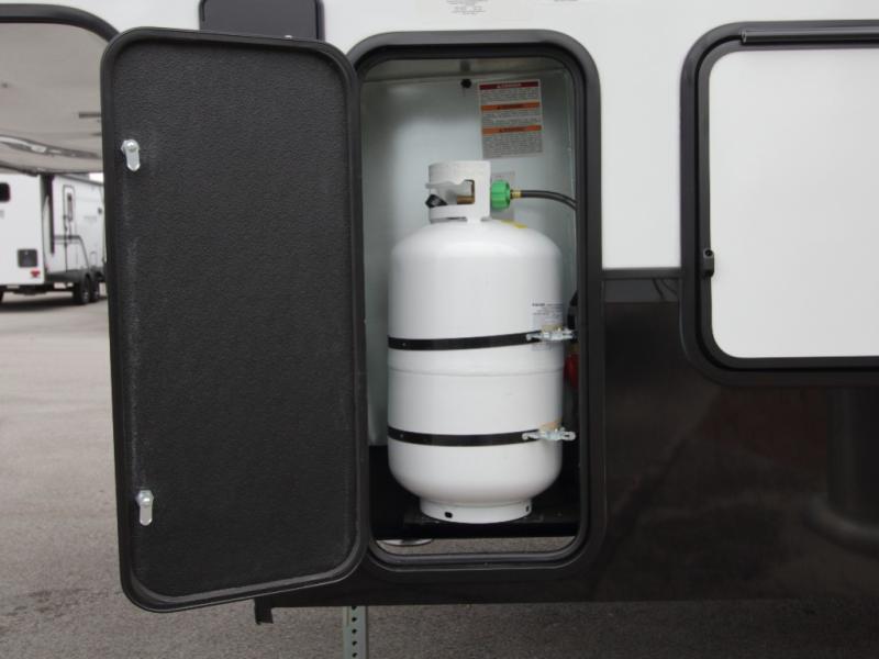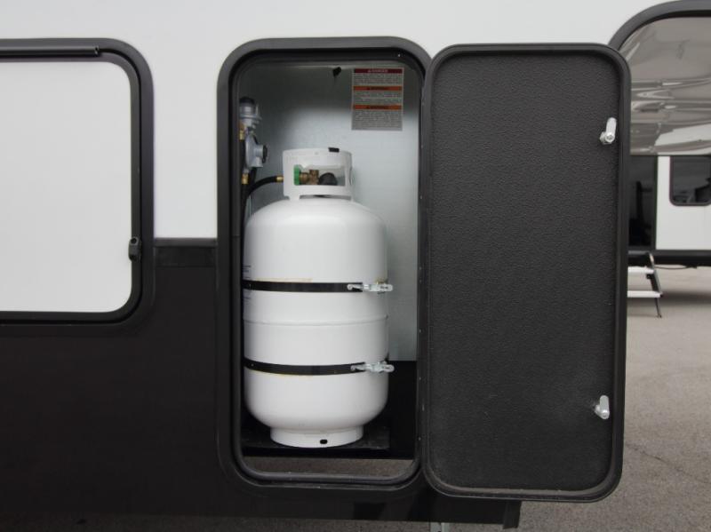 Enjoy smooth towing with the Rota-Flex pin box, 7,000 lb. flipped Dexter axles, leaf spring suspension, and 16 inch wheels with G rated tires. A 30 inch entry door, SolidStep entry system, and lighted pass through storage add everyday convenience.