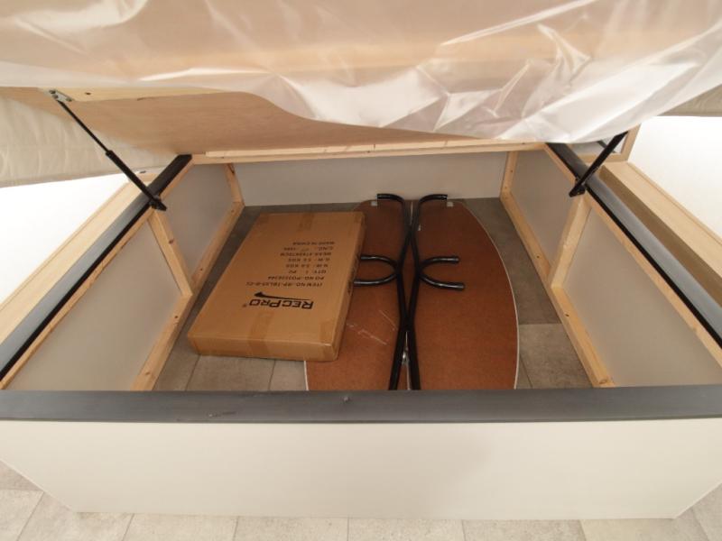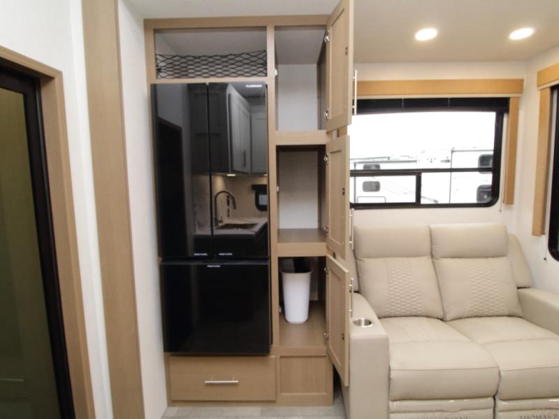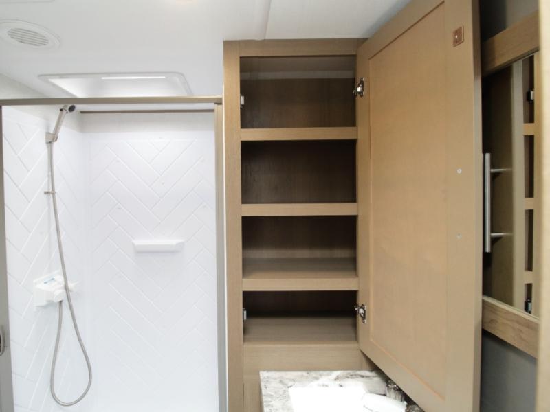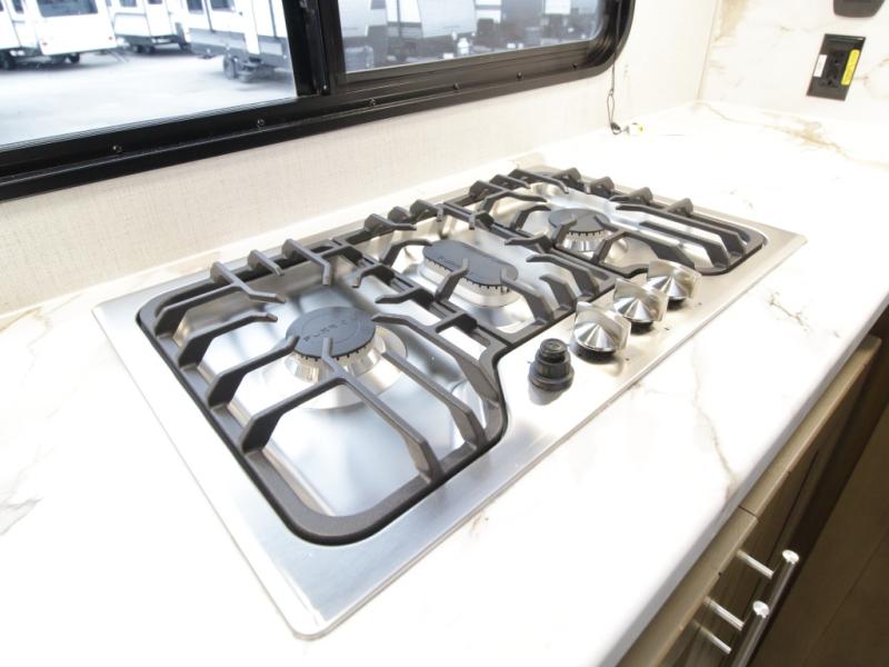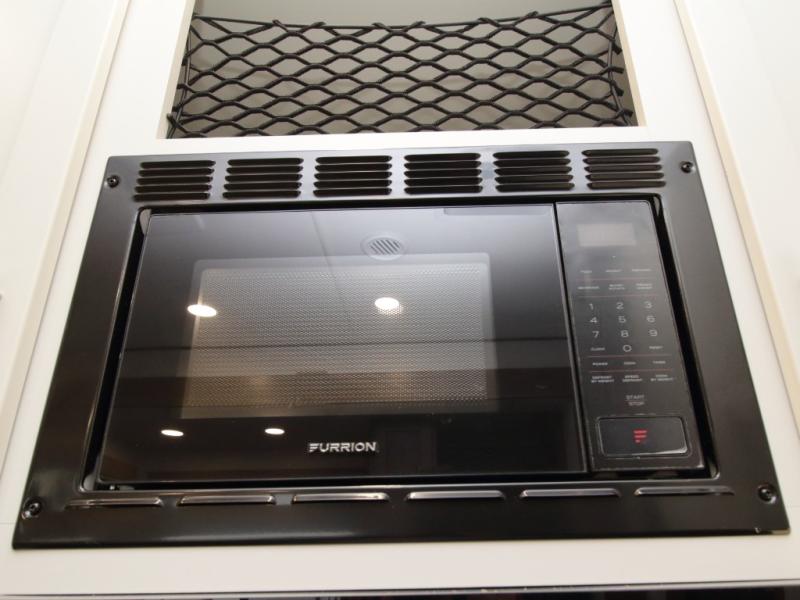 Prepare meals with ease using the deep stainless steel sink, high rise pull out sprayer faucet, 10 cu. ft. 12V refrigerator, microwave, and Furrion three burner range with low profile hood vent. Full extension drawer guides and LED lighting add residential ease.