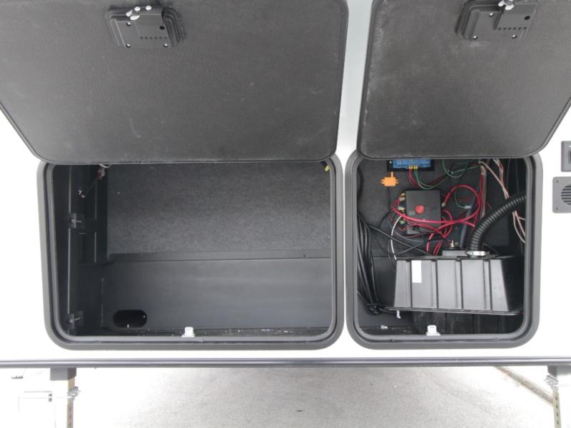 Built on 10 and 12 inch I beams with frame welded tie downs and a 100 inch wide body, this toy hauler is ready for heavy hauling. Laminated fiberglass sidewalls, an aerodynamic fiberglass front cap with LED lighting, and a fully walkable roof ensure long lasting strength and protection. The heated polypropylene enclosed underbelly keeps tanks and valves protected in all seasons.
