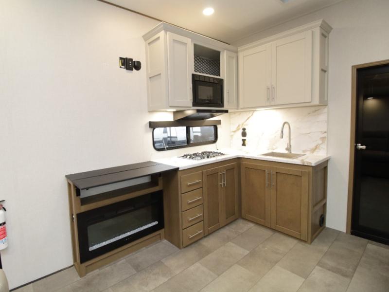 A carpet free layout, fiberglass backed linoleum, tall slide height, hardwood cabinetry, and night shades create a clean, modern look. A 5K BTU electric fireplace adds cozy ambiance, while in floor heating ducts and Tru Fit slide construction improve overall comfort and durability.