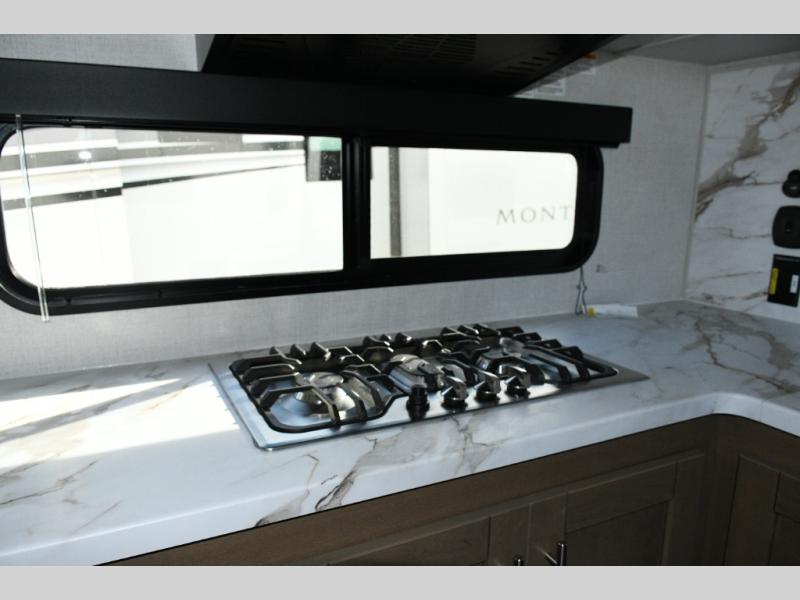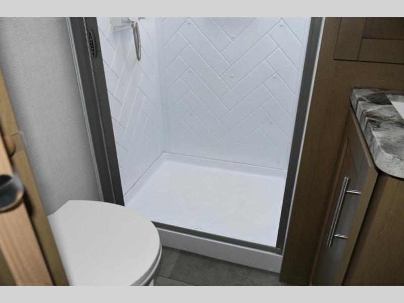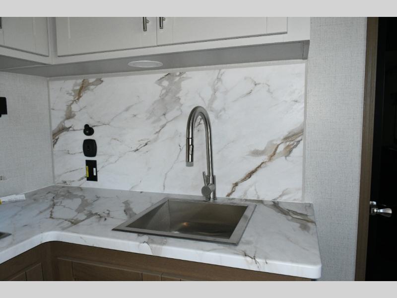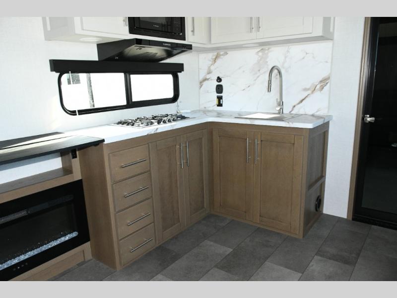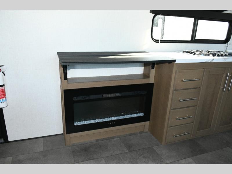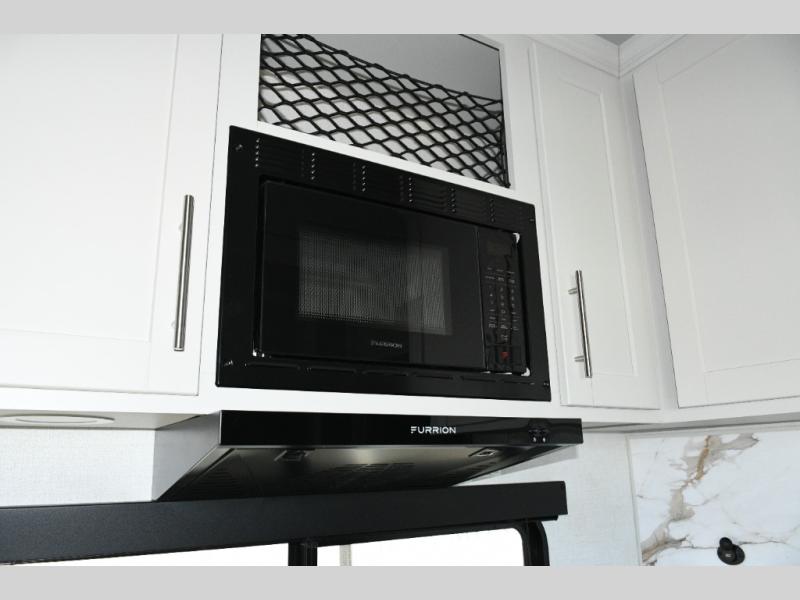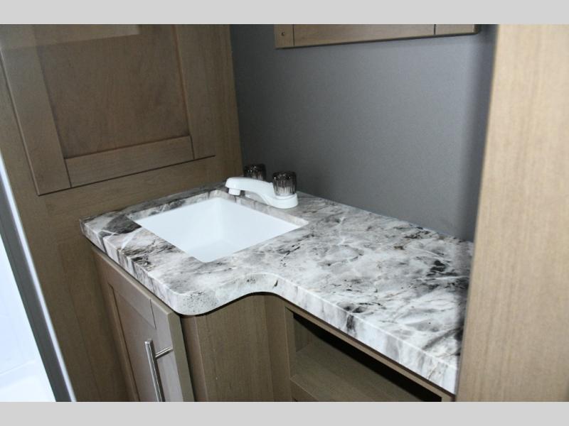 The kitchen is designed for real-world camping. A flip-up countertop instantly expands prep space, while the 10 cu. ft. 12V refrigerator, range, and sink make cooking on the road simple and efficient. Overhead cabinets throughout the coach ensure there’s room for gear, supplies, and long-weekend provisions.
