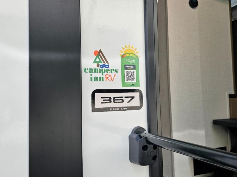 The Fuzion Impact Edition 367 blends rugged hauling power with residential comfort. With a 14' garage, loft, and both a full and half bath, this tandem-axle toy hauler is built to take your toys along for the ride while keeping your family or friends comfortable on every adventure.