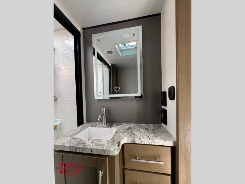 Embrace the great outdoors with a Fuzion Impact Edition toy hauler by Keystone! There are laminated fiberglass sidewalls and a 8' 4" wide-body construction for your toys and gear! The one-piece polypropylene heated underbelly includes enclosed tanks and valves which will help extend your camping season, and the leaf spring suspension system will provide smooth towing. Head inside to enjoy night shades, hardwood cabinetry, and fiberglass backed linoleum floor with no carpet for easy cleaning. Each model also includes a Girard on-demand water heater, two 30 lb. LP tanks, recessed LED puck lighting throughout, and the list of comforts goes on!