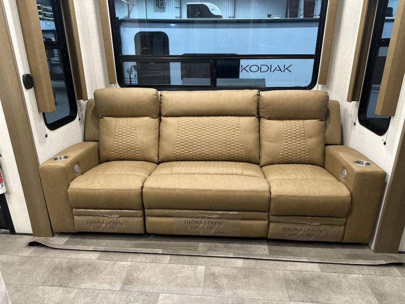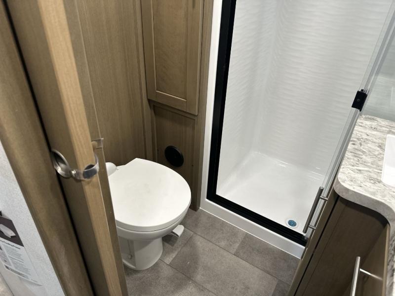 Fun with your toys is made easy with this 14' garage area toy hauler! Once the toys are unloaded, relax on the dual opposing sofas, or take a rest on the electric queen bed. The kids or guests can climb up into the loft that includes a bunk mat, and there is a half bath in the garage for added convenience. This model includes a peninsula countertop with plenty of space to prep meals and clean up, and there is a 16 cu. ft. 12V refrigerator for perishables. You'll find a residential shower with a seat in the dual entry bath, and the front bedroom will feel just like home with its Fuzion king bed and wardrobe slide for all your clothes.