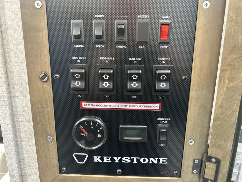 Embrace the great outdoors with a Fuzion Impact Edition toy hauler by Keystone! There are laminated fiberglass sidewalls and a 8' 4" wide-body construction for your toys and gear! The one-piece polypropylene heated underbelly includes enclosed tanks and valves which will help extend your camping season, and the leaf spring suspension system will provide smooth towing. Head inside to enjoy night shades, hardwood cabinetry, and fiberglass backed linoleum floor with no carpet for easy cleaning. Each model also includes a Girard on-demand water heater, two 30 lb. LP tanks, recessed LED puck lighting throughout, and the list of comforts goes on!