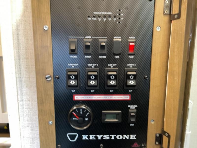 Embrace the great outdoors with a Fuzion Impact Edition toy hauler by Keystone! There are laminated fiberglass sidewalls and a 8' 4" wide-body construction for your toys and gear! The one-piece polypropylene heated underbelly includes enclosed tanks and valves which will help extend your camping season, and the leaf spring suspension system will provide smooth towing. Head inside to enjoy night shades, hardwood cabinetry, and fiberglass backed linoleum floor with no carpet for easy cleaning. Each model also includes a Girard on-demand water heater, two 30 lb. LP tanks, recessed LED puck lighting throughout, and the list of comforts goes on!