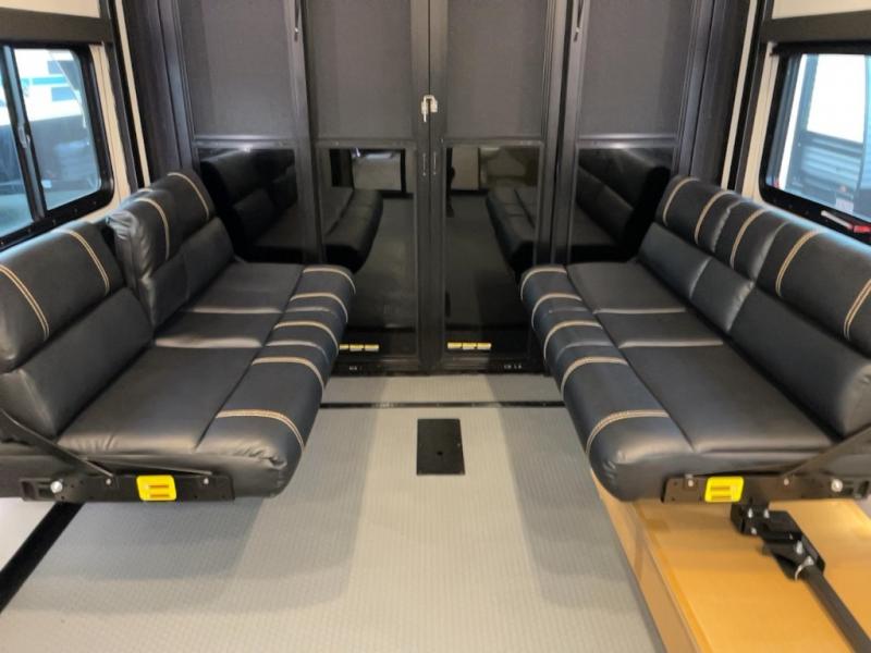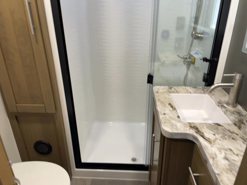 Fun with your toys is made easy with this 14' garage area toy hauler! Once the toys are unloaded, relax on the dual opposing sofas, or take a rest on the electric queen bed. The kids or guests can climb up into the loft that includes a bunk mat, and there is a half bath in the garage for added convenience. This model includes a peninsula countertop with plenty of space to prep meals and clean up, and there is a 16 cu. ft. 12V refrigerator for perishables. You'll find a residential shower with a seat in the dual entry bath, and the front bedroom will feel just like home with its Fuzion king bed and wardrobe slide for all your clothes.